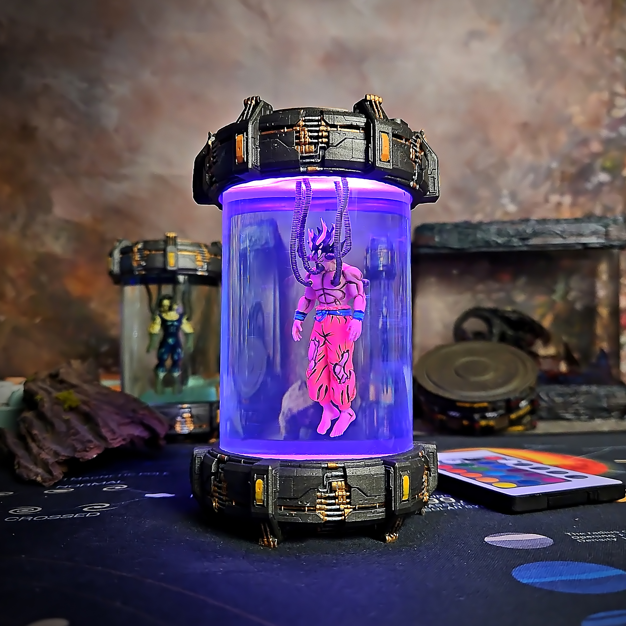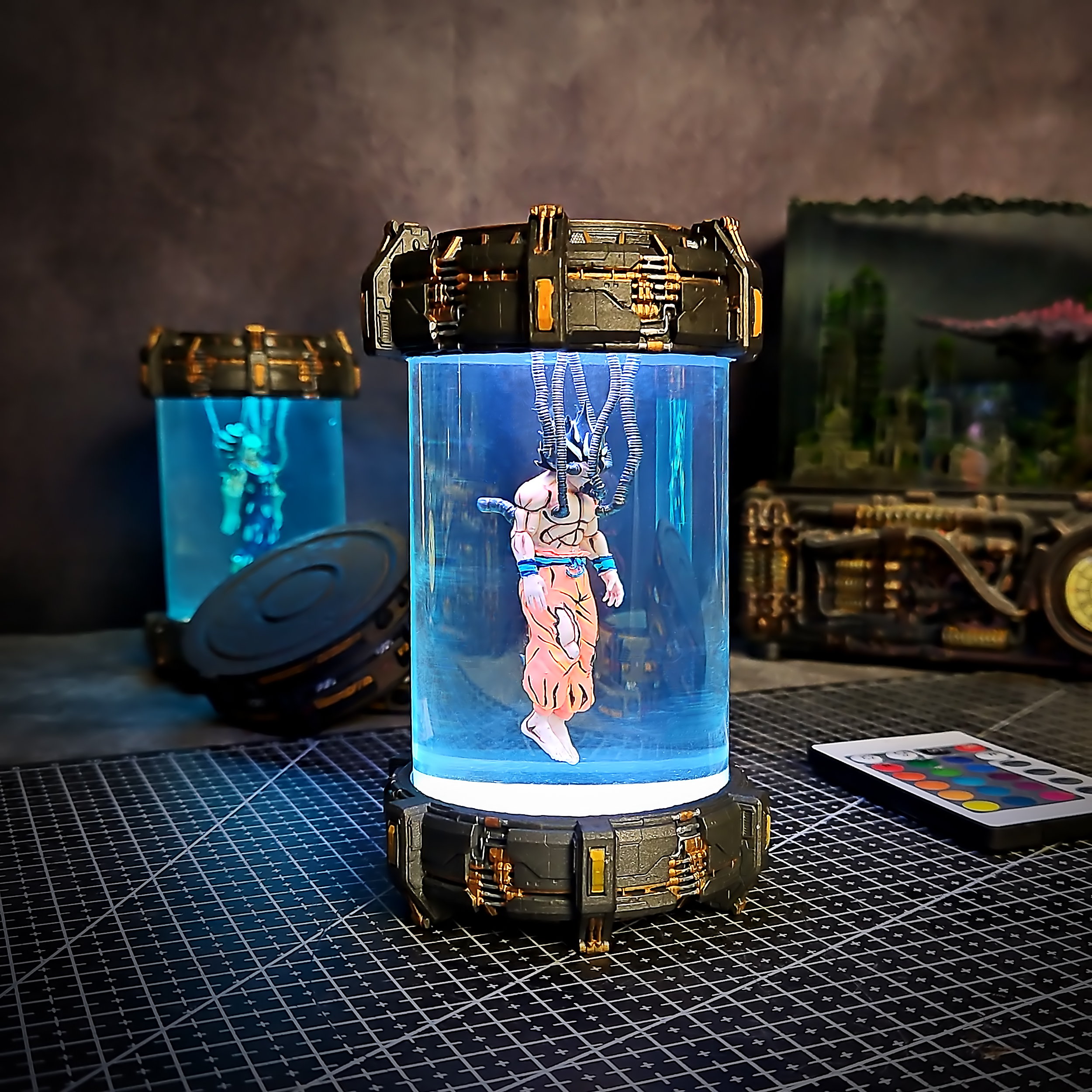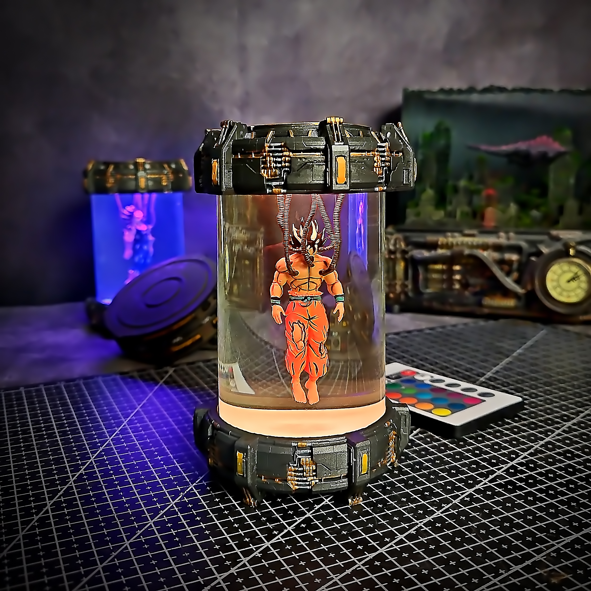 Imagine Goku in a sci-fi lab experiment – a tribute to the legendary Saiyan through a cyberpunk lens. Glowing ki energy radiates from the core, adding a bold twist to classic character design.