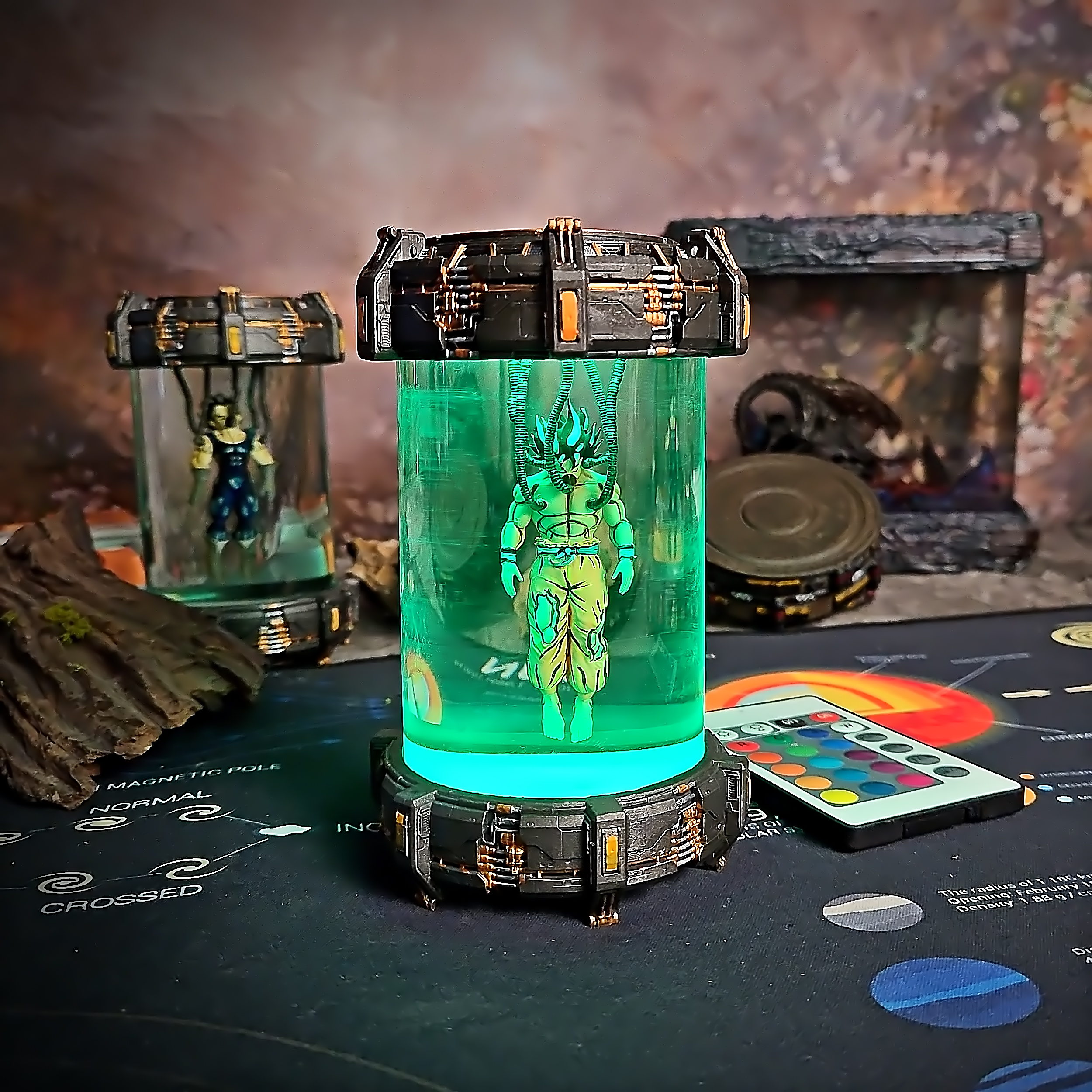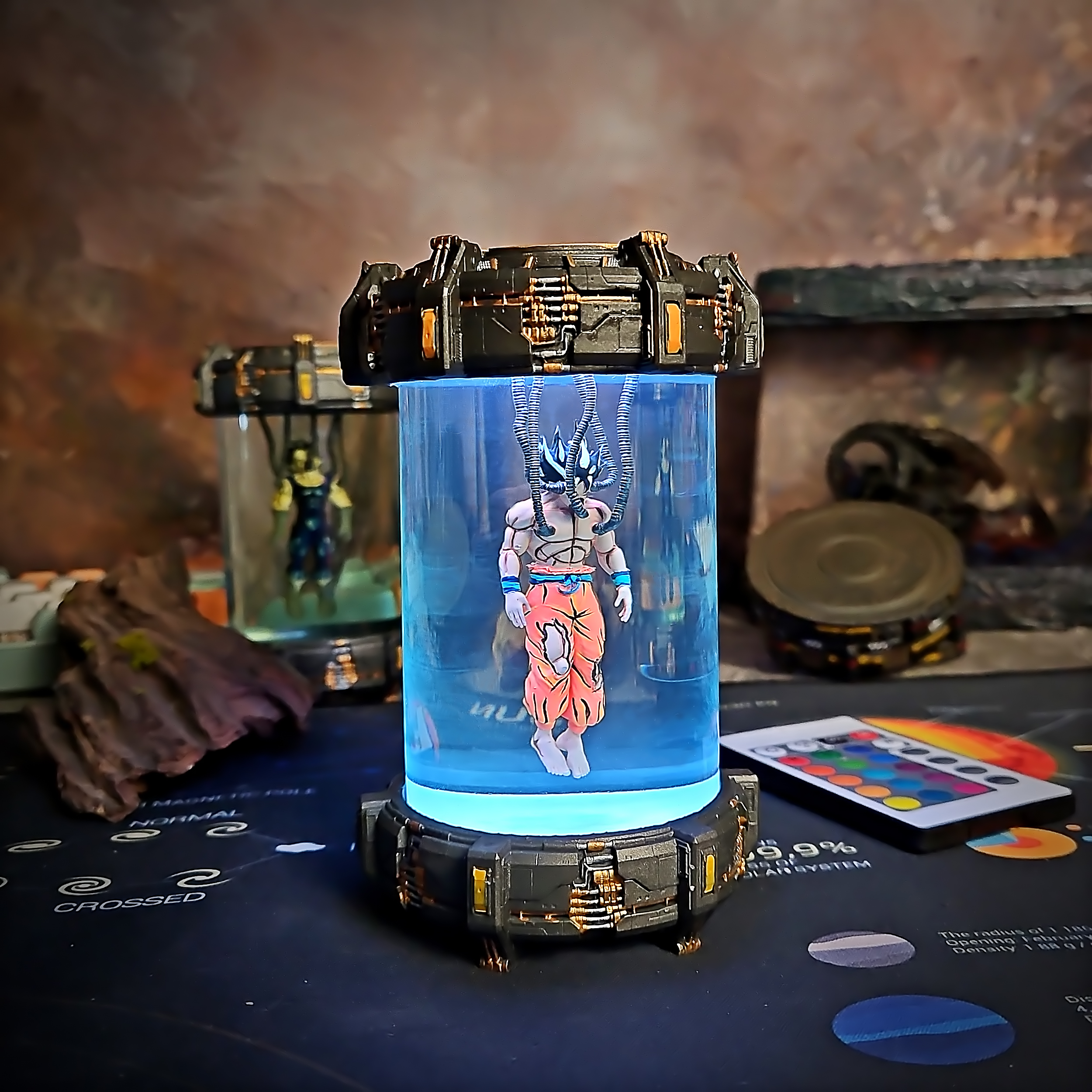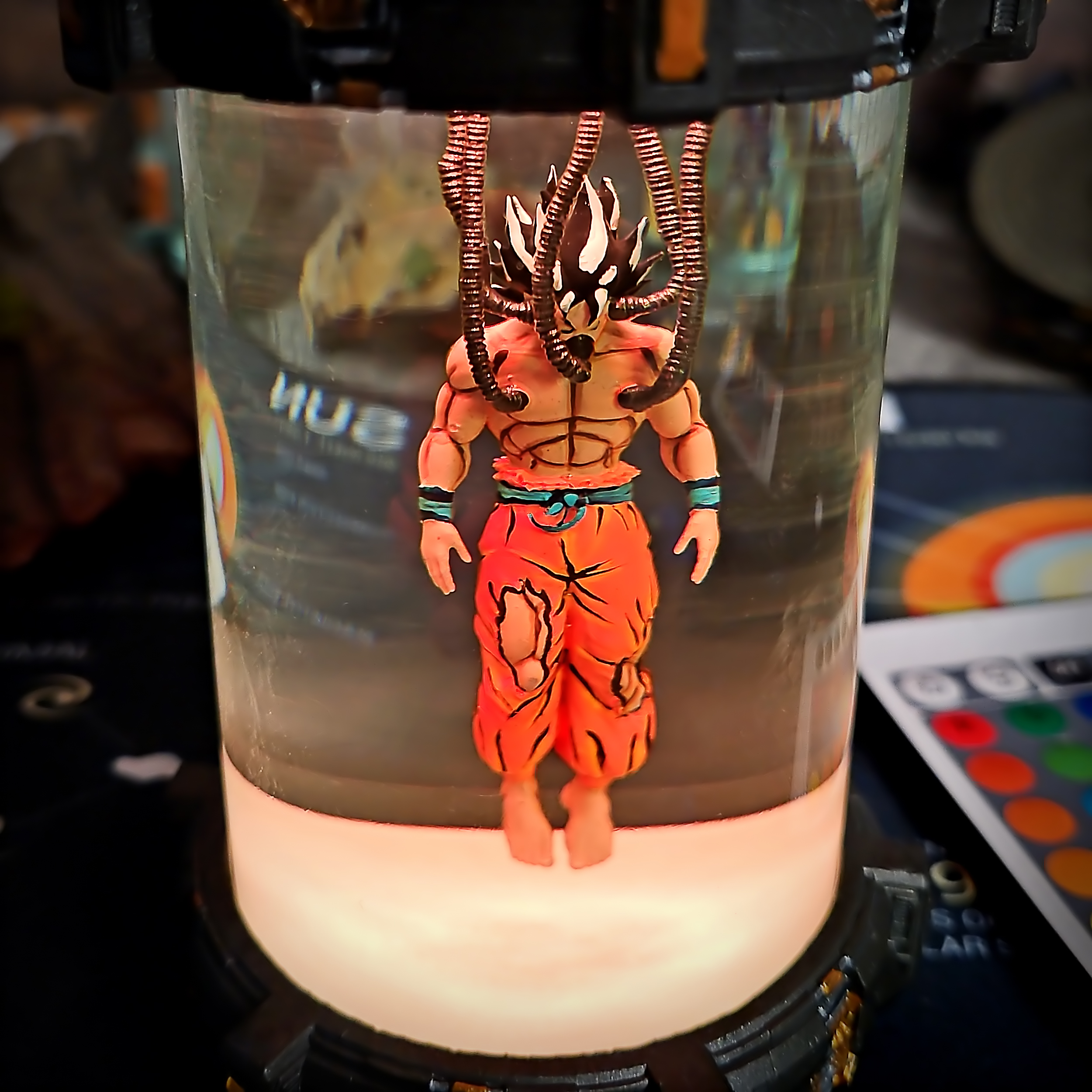 Imagine Goku in a sci-fi lab experiment – a tribute to the legendary Saiyan through a cyberpunk lens. Glowing ki energy radiates from the core, adding a bold twist to classic character design.