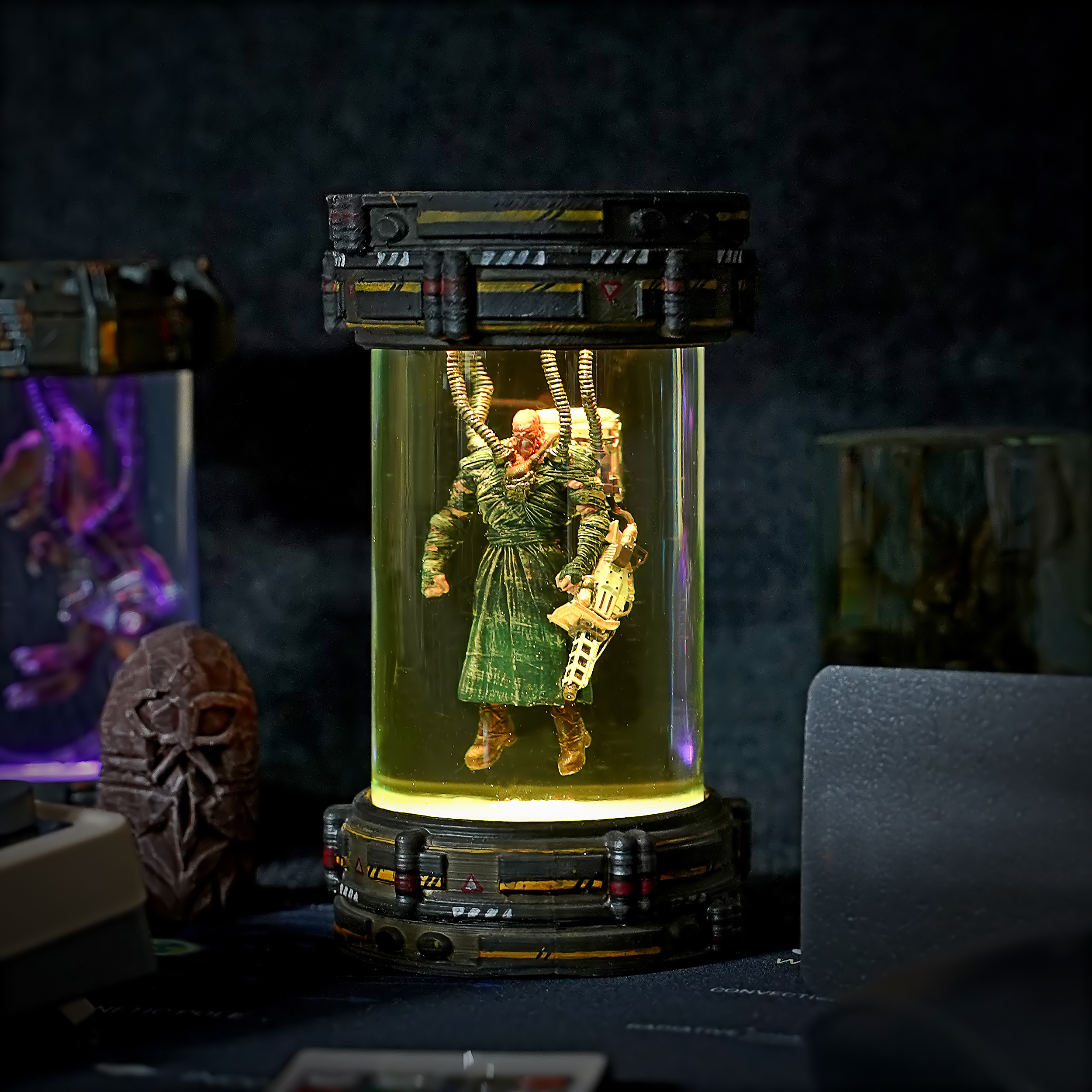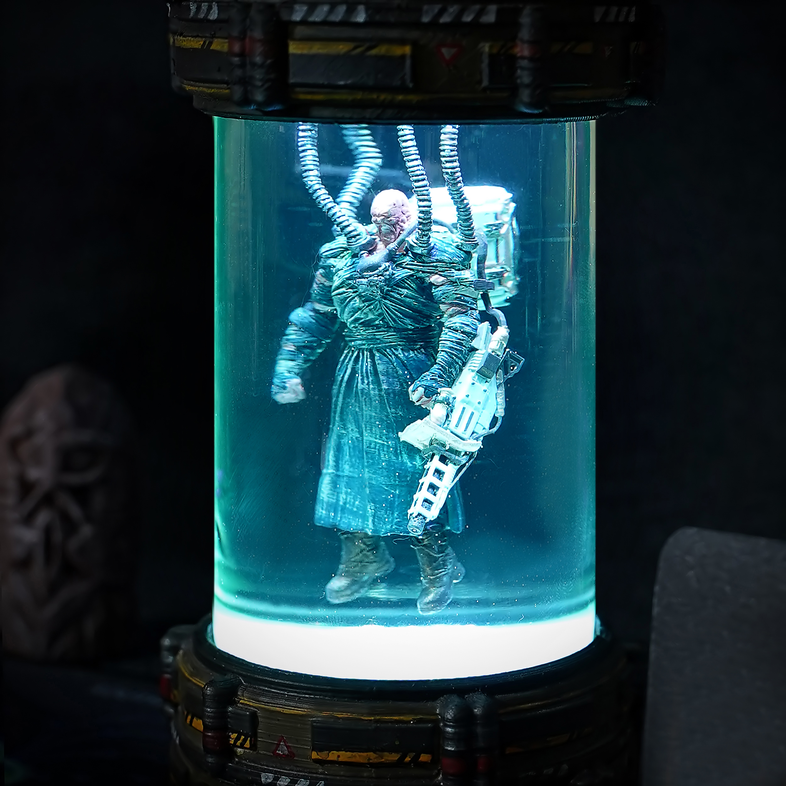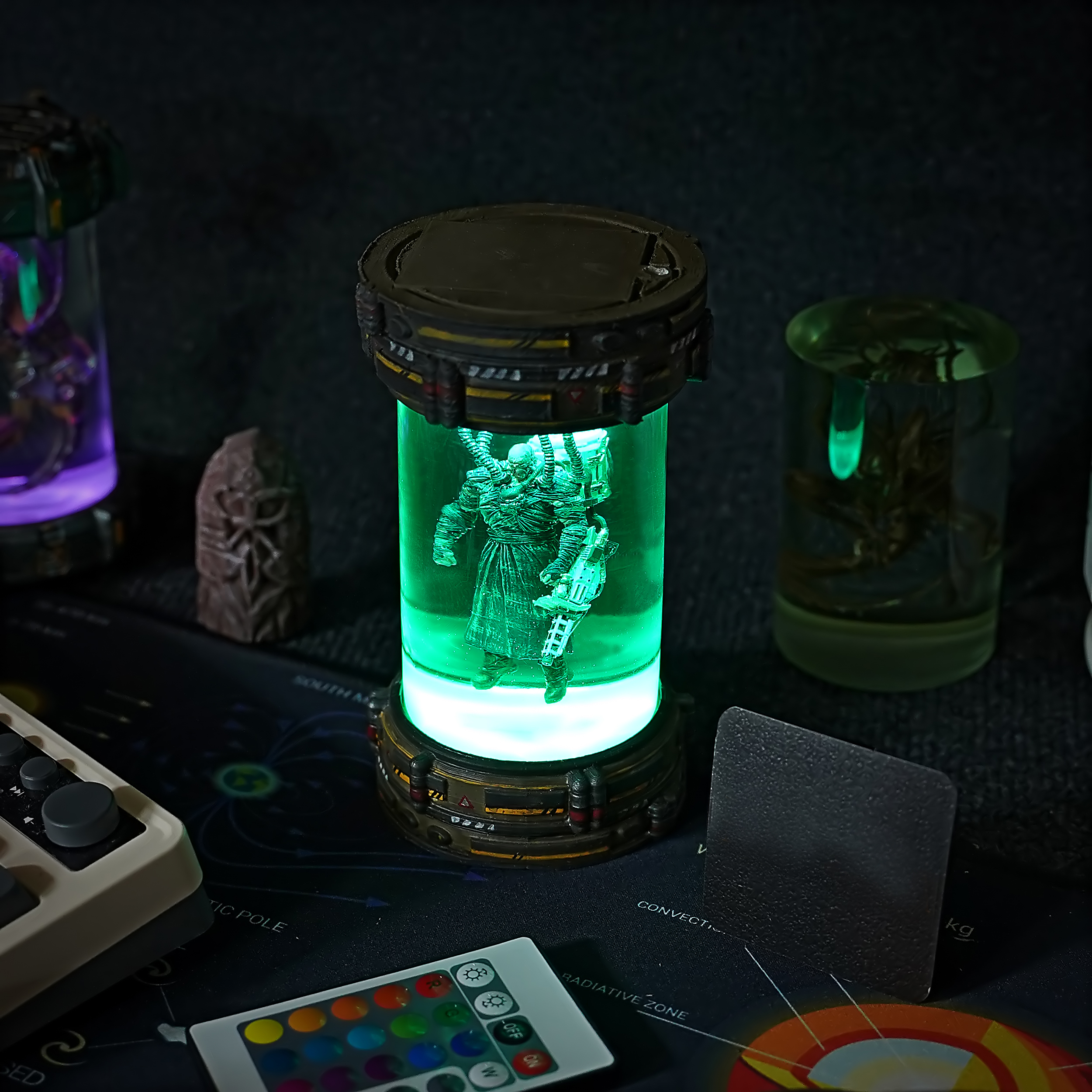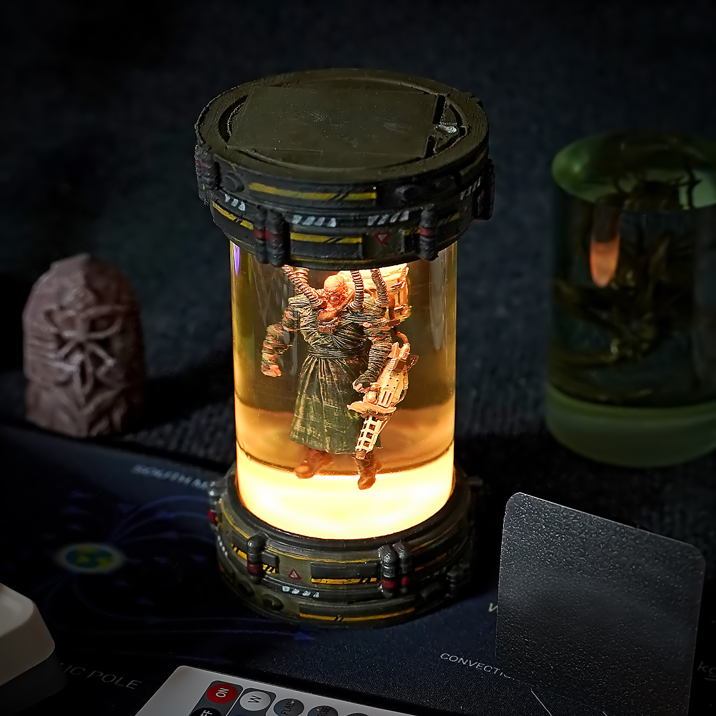 An original alien species crafted for this lamp series. Nemexis represents the mystery of undiscovered galactic life forms and is contained in a glowing resin stasis tube.