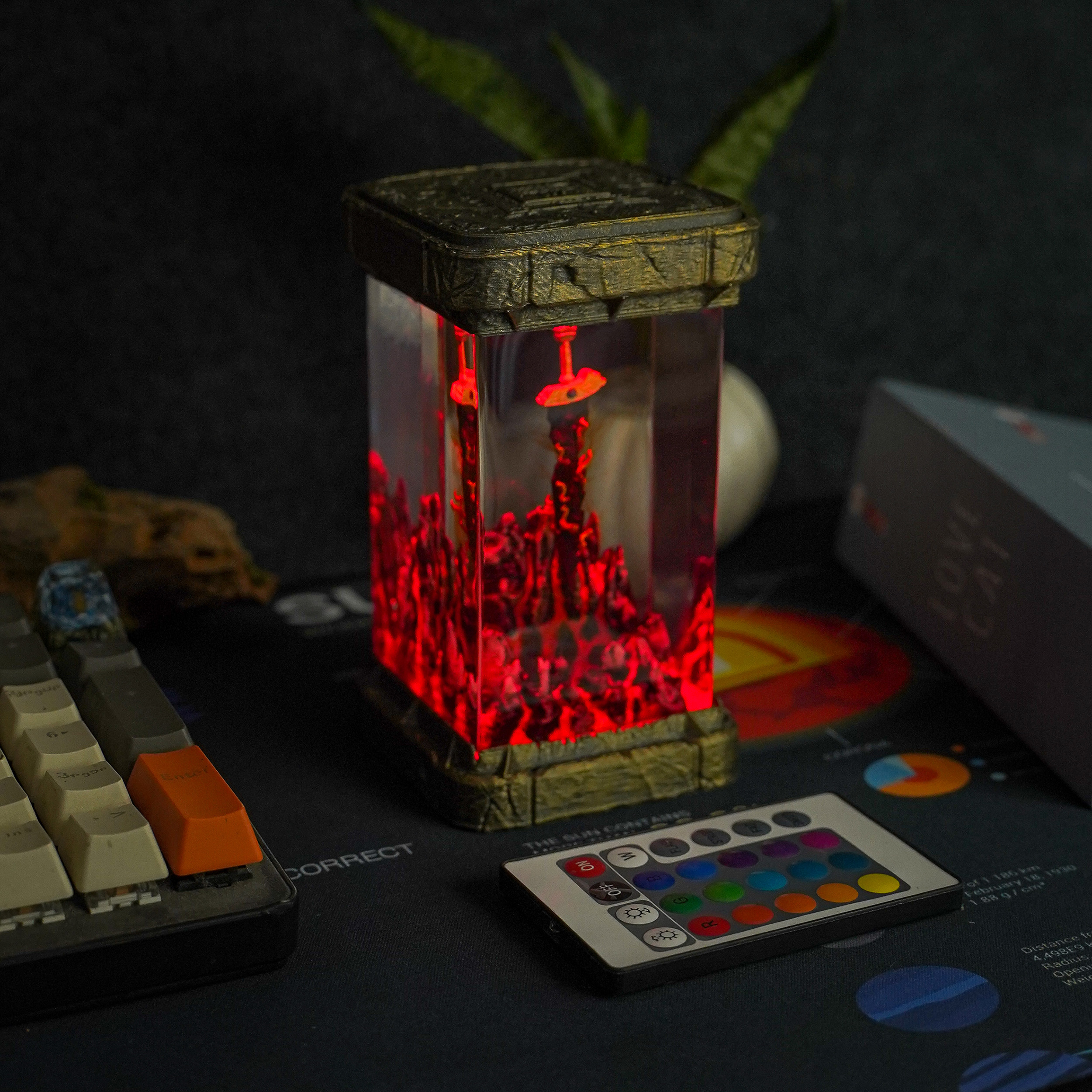 A tribute to the fearsome blade wielded by Maliketh, this lamp showcases the brutal elegance of the Black Blade Greatsword. Its form is dynamic and imbued with energy, glowing in dramatic contrast to the darkness that surrounds it.