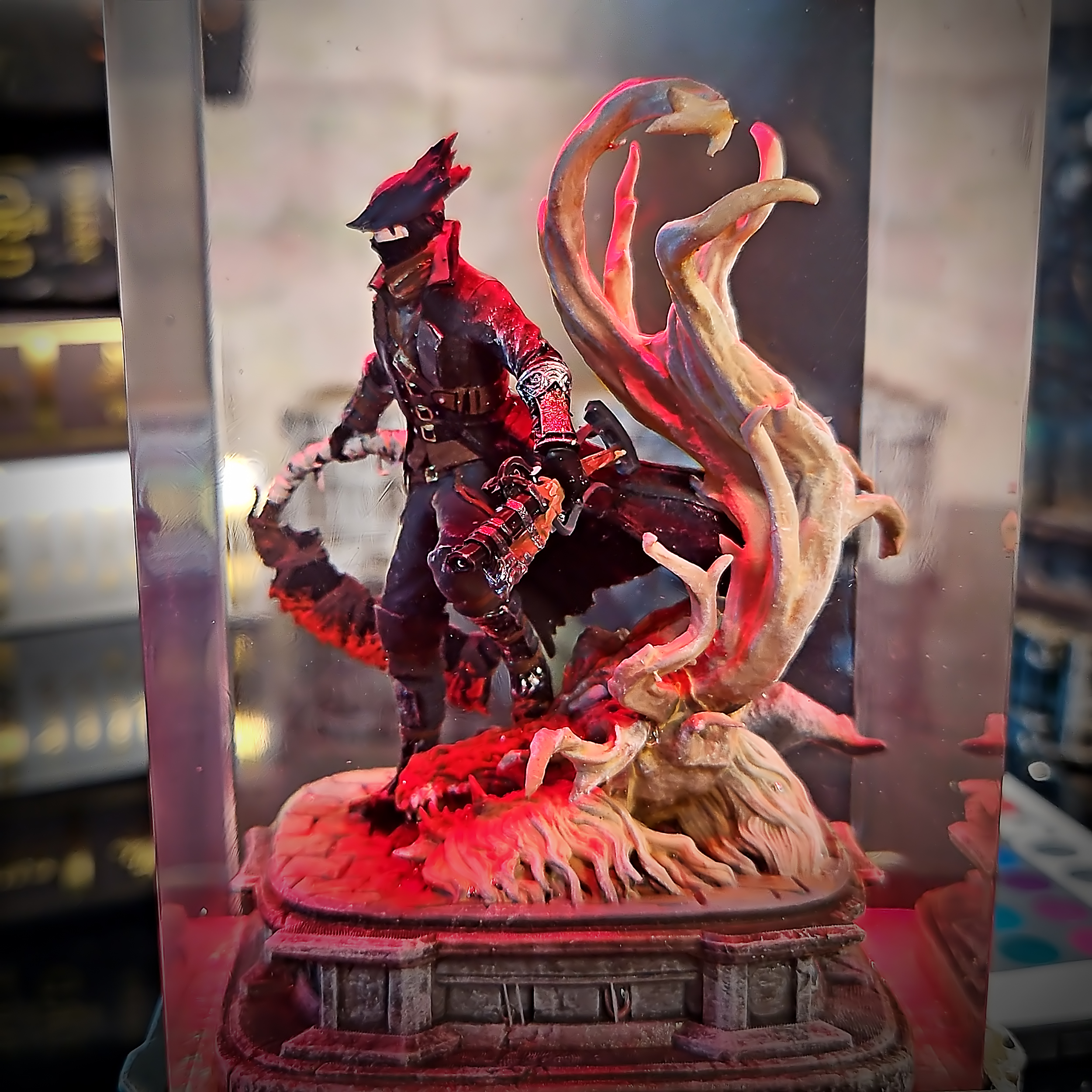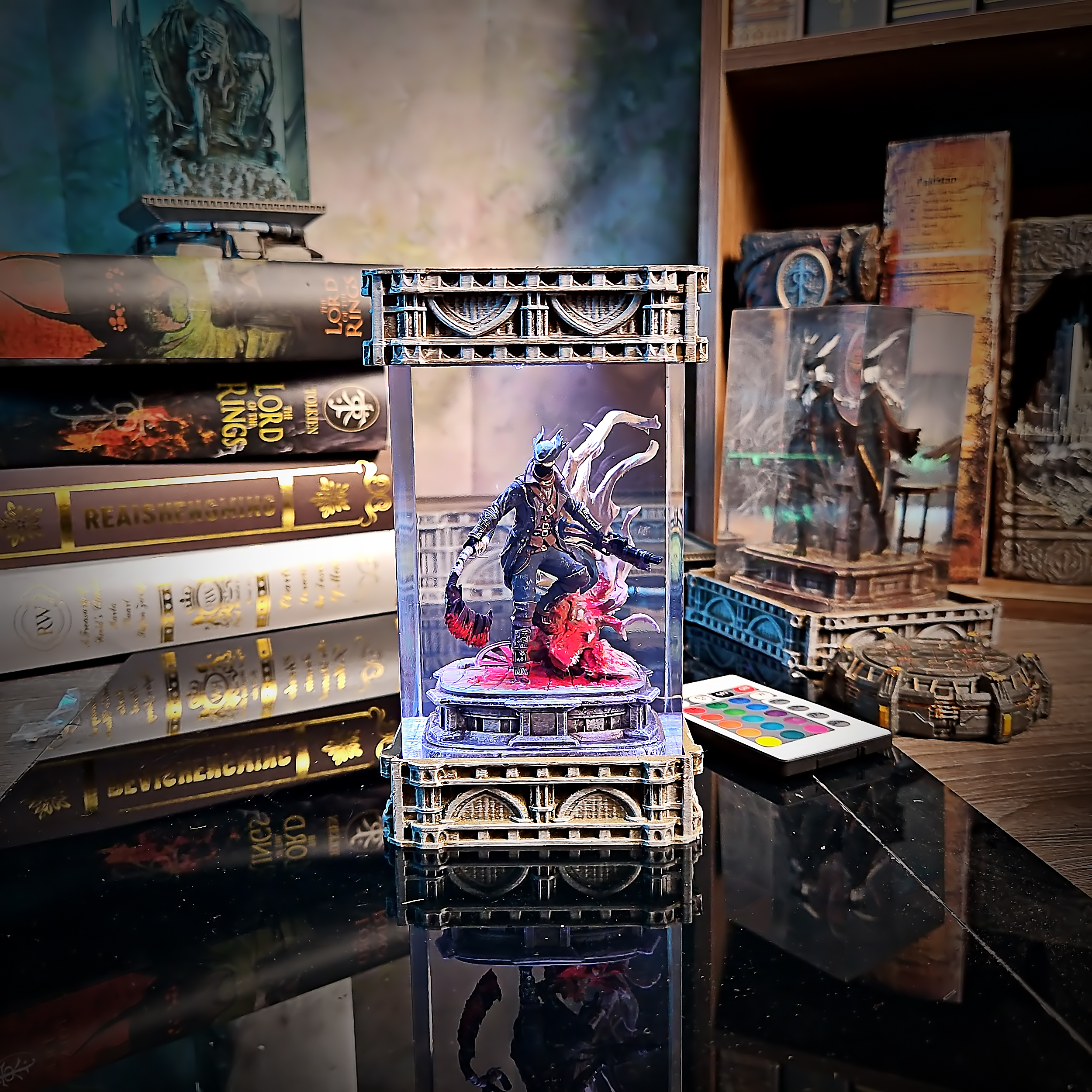Step into the haunting world of Bloodborne with this resin lamp featuring the Hunter and Lady Maria. Capturing the eerie atmosphere and intricate costumes, this piece showcases the characters’ haunting presence with detailed craftsmanship. LED lighting accentuates the gothic elements and fine details.