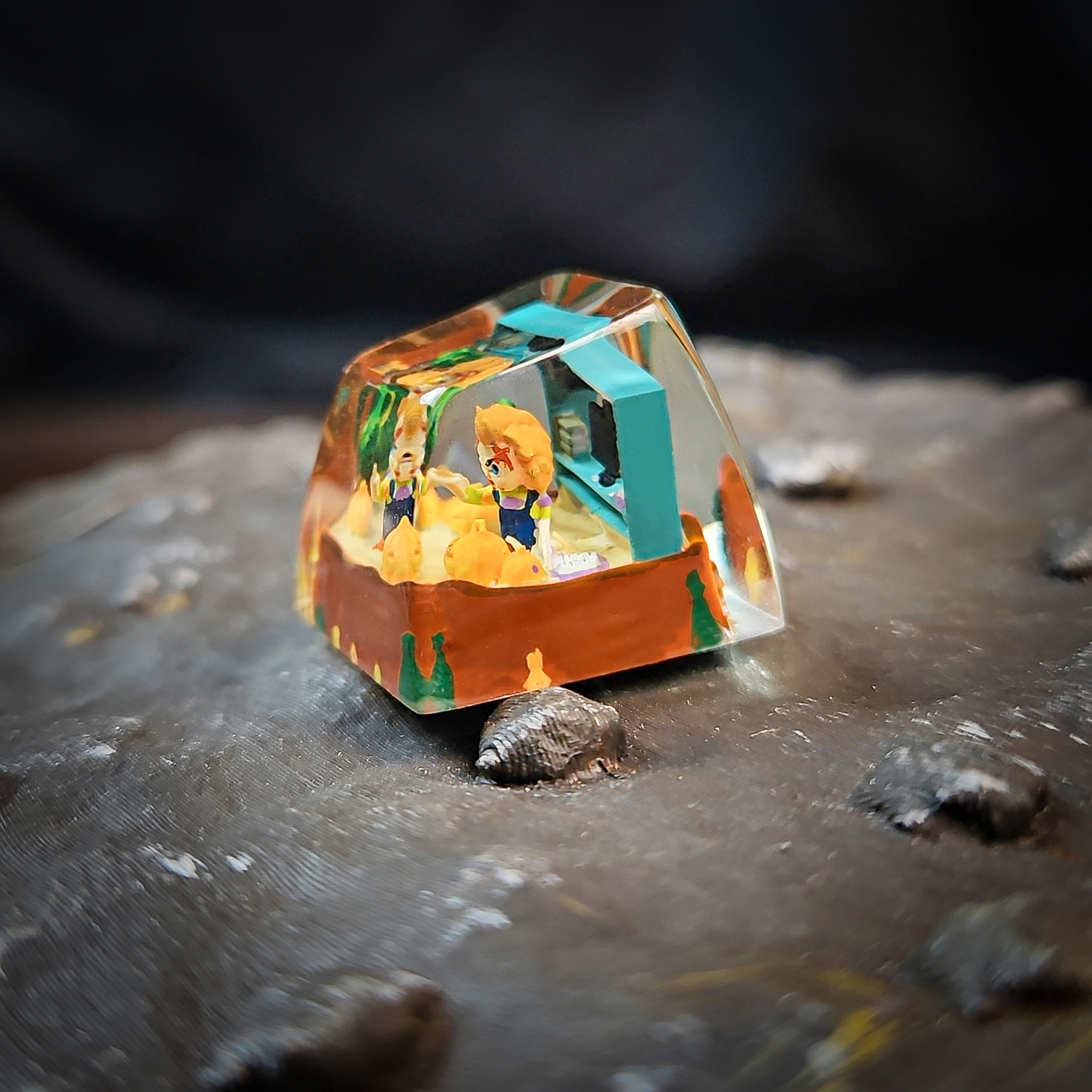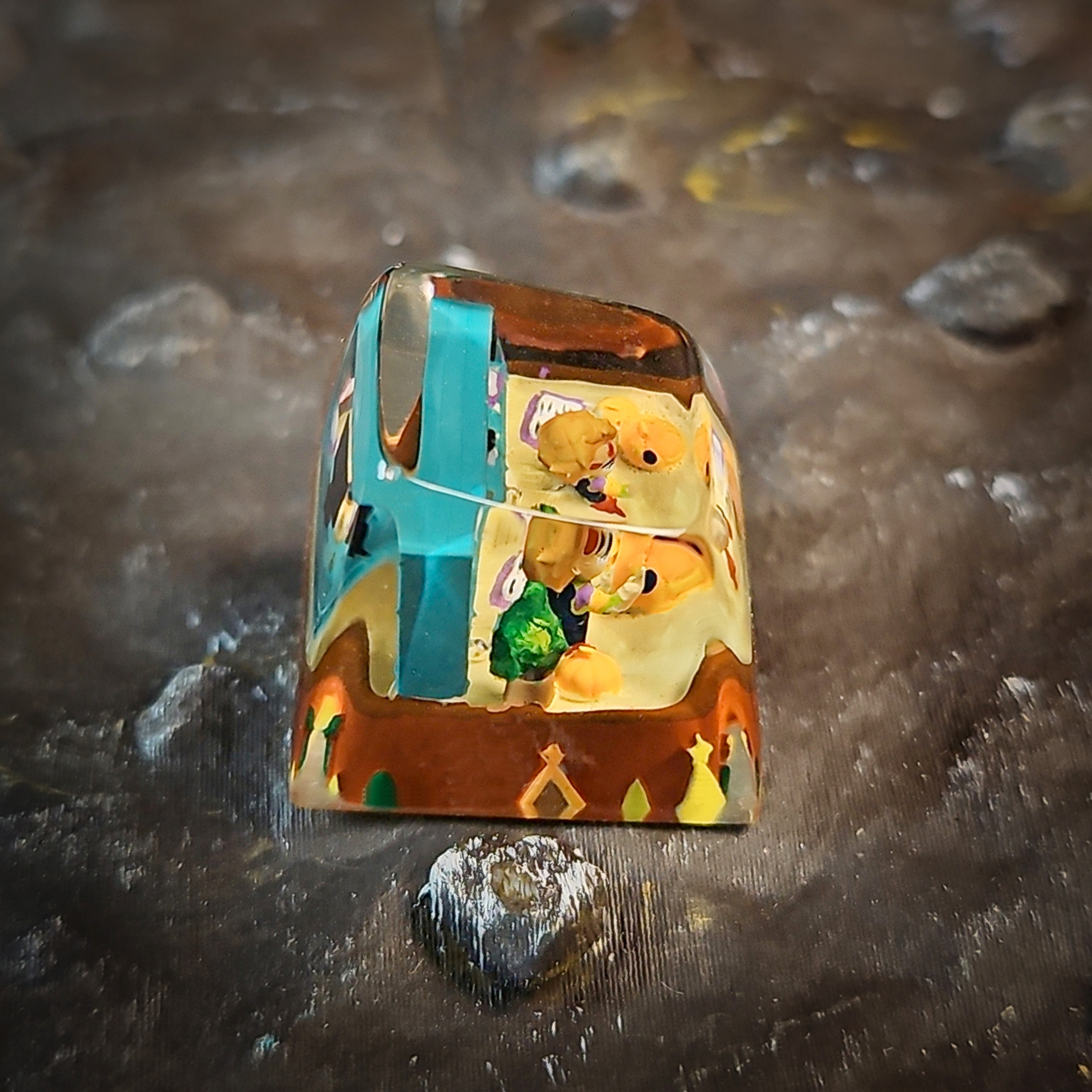 This handcrafted 1u resin keycap captures the chilling essence of the infamous Chucky doll from classic horror. Encased under a crystal-clear resin dome, the miniature figure’s sinister grin, piercing eyes, and stitched scars are meticulously sculpted and painted by hand to bring the iconic killer doll to life in striking detail. Every tiny crack and expression is preserved, making it a hauntingly realistic miniature.