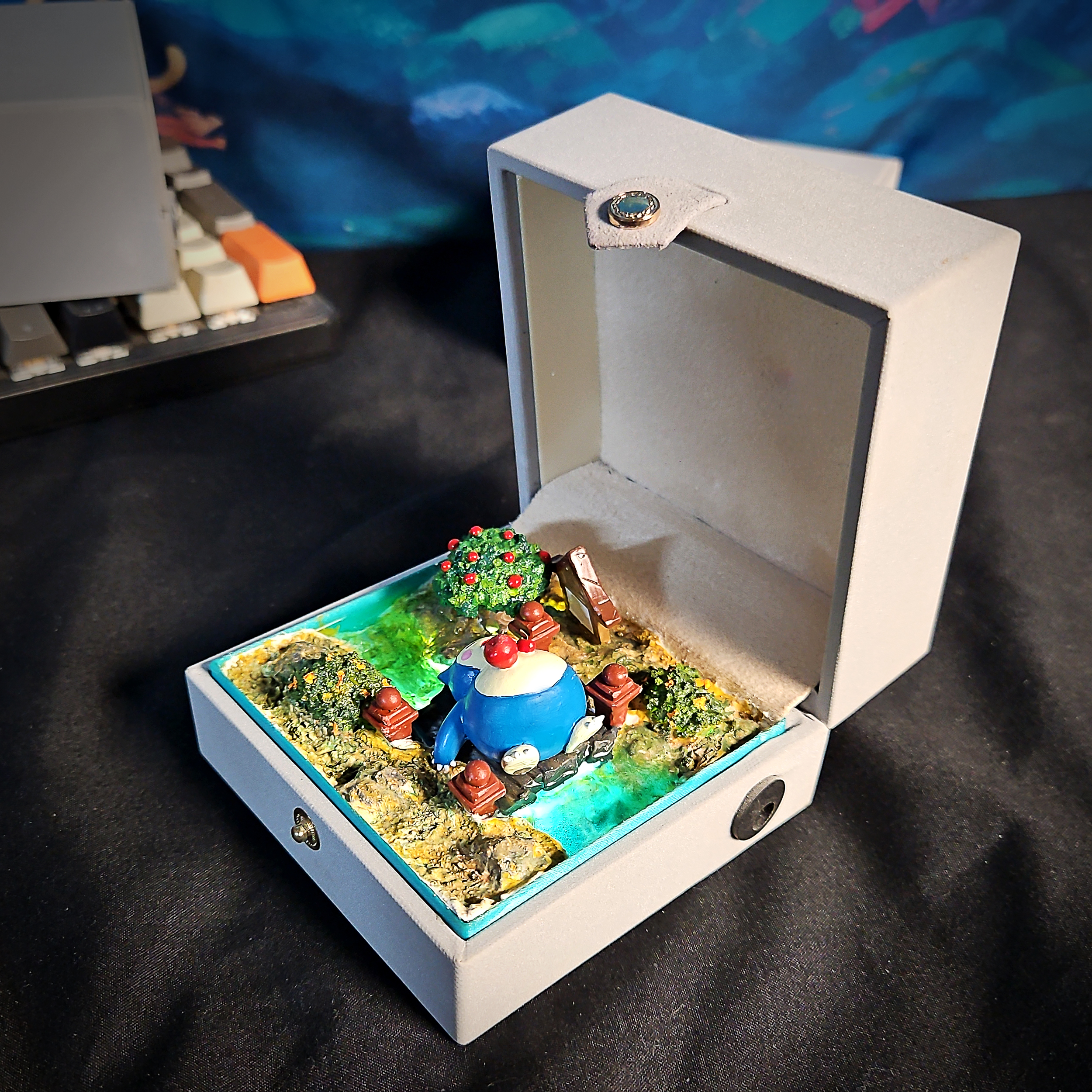 Miniature scene elements such as trees, figures, or buildings are handcrafted from resin using silicone molds or sculpted manually. These pieces are also painted and detailed to match the overall composition and bring the miniature world to life.