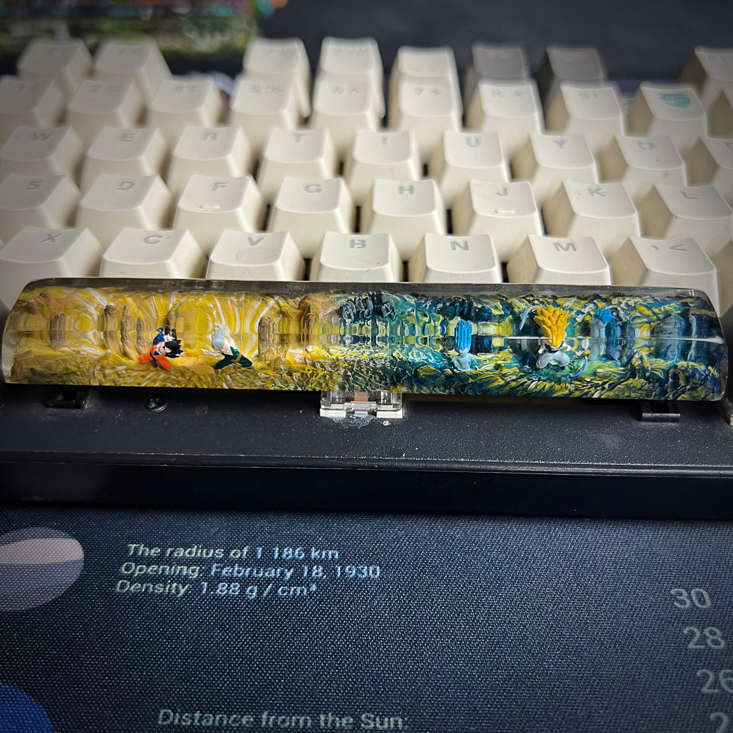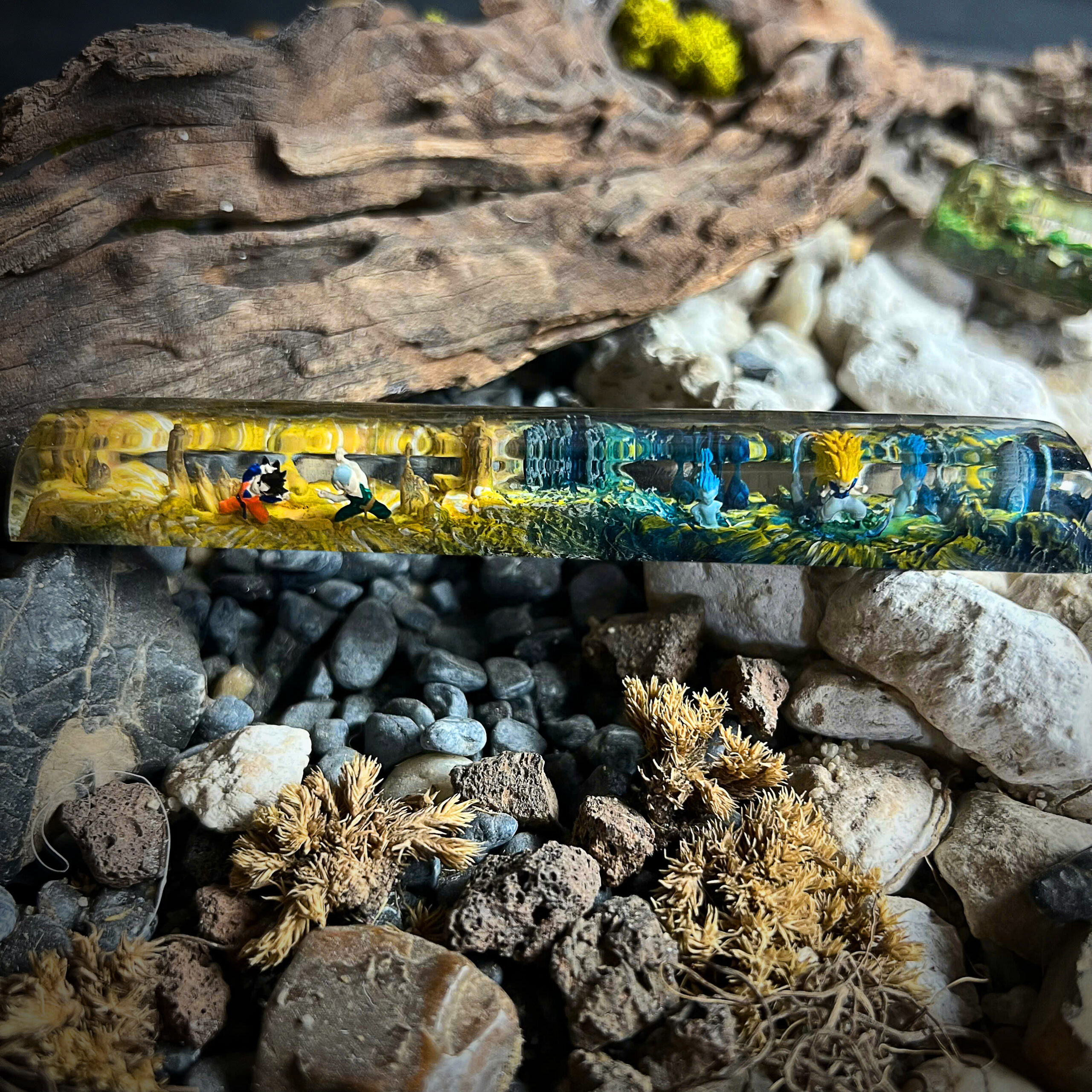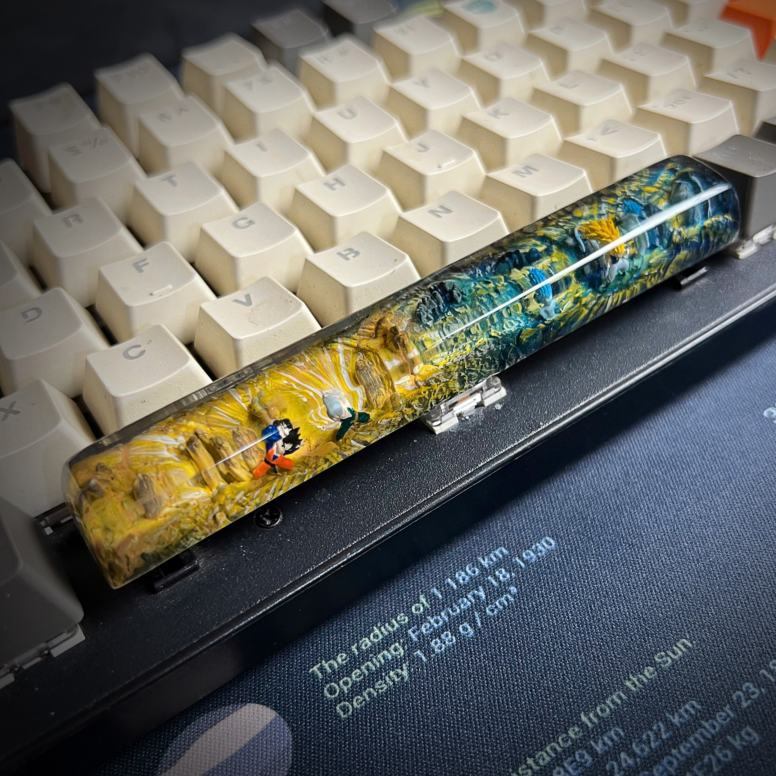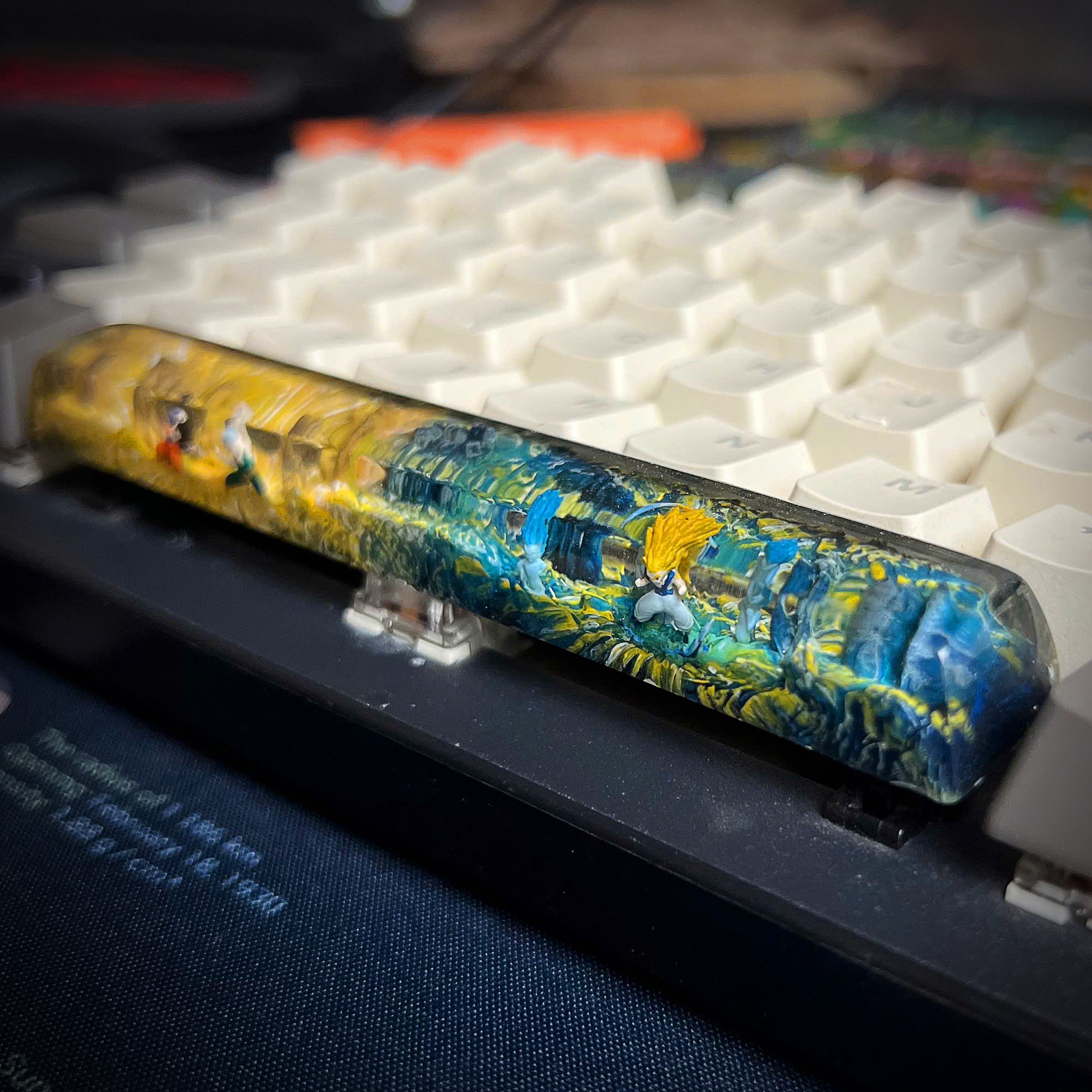 Bring the spirit of Dragon Ball Z to your mechanical keyboard with this handmade resin spacebar, inspired by the legendary anime series that defined generations. This unique keycap showcases iconic elements from the DBZ universe, blending vibrant colors, energy waves, and character silhouettes into a stunning piece of functional art.