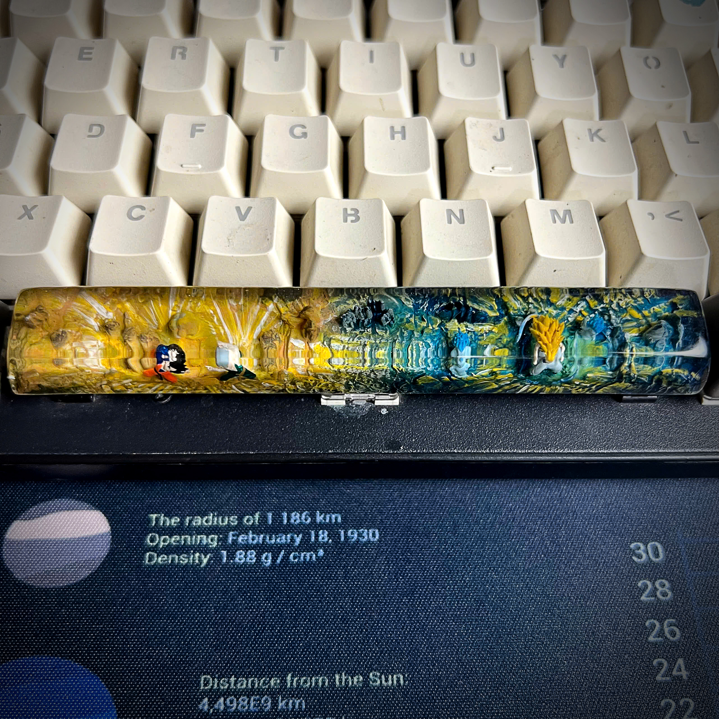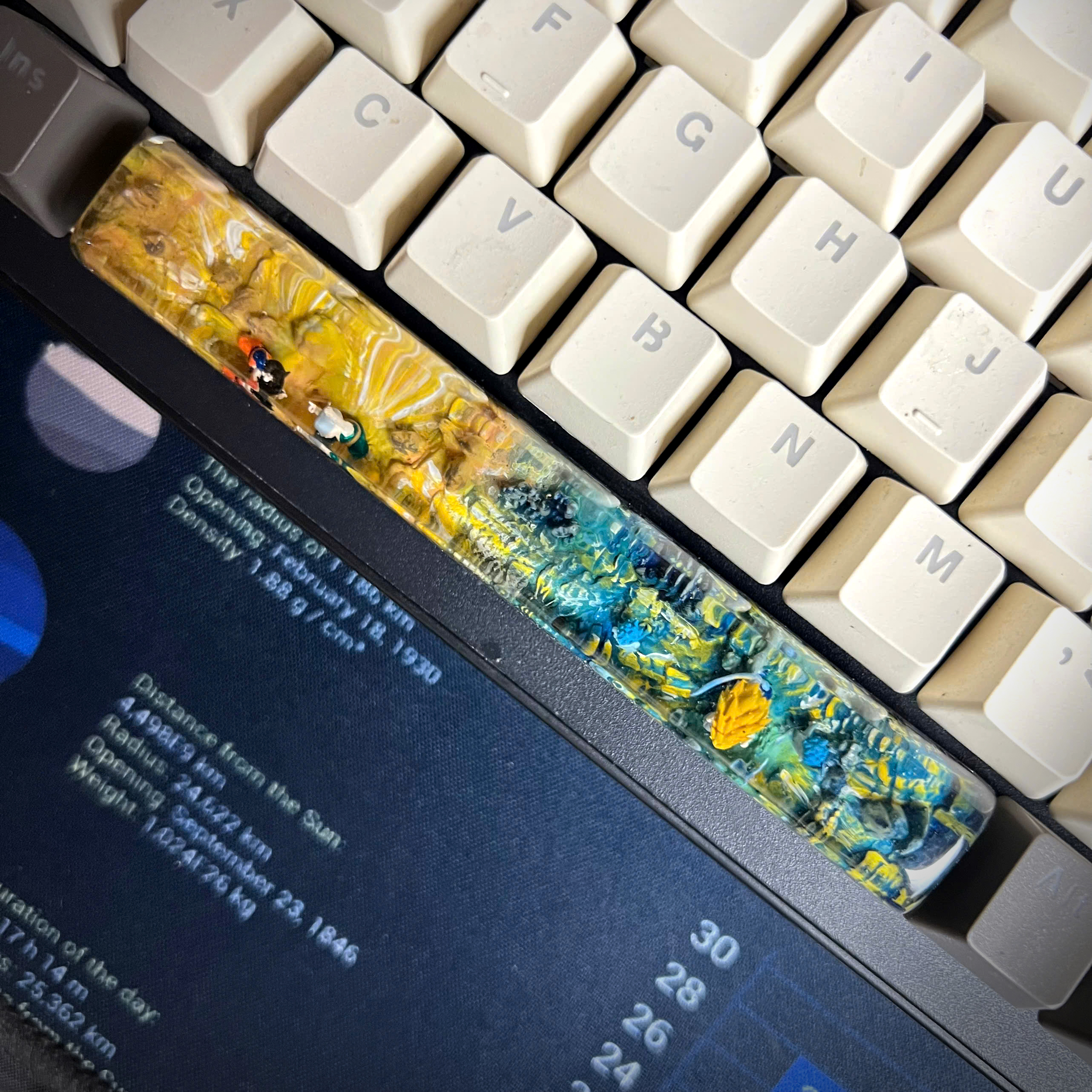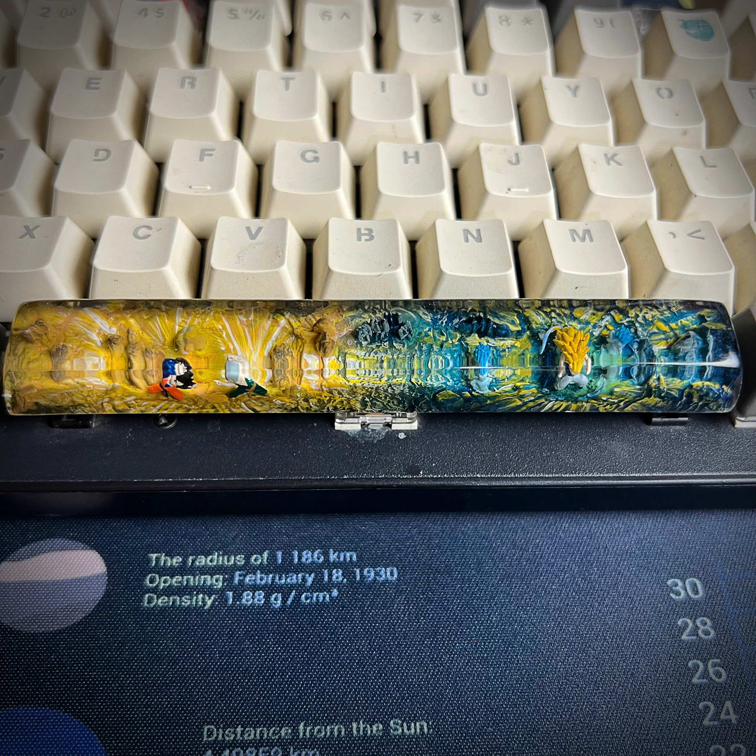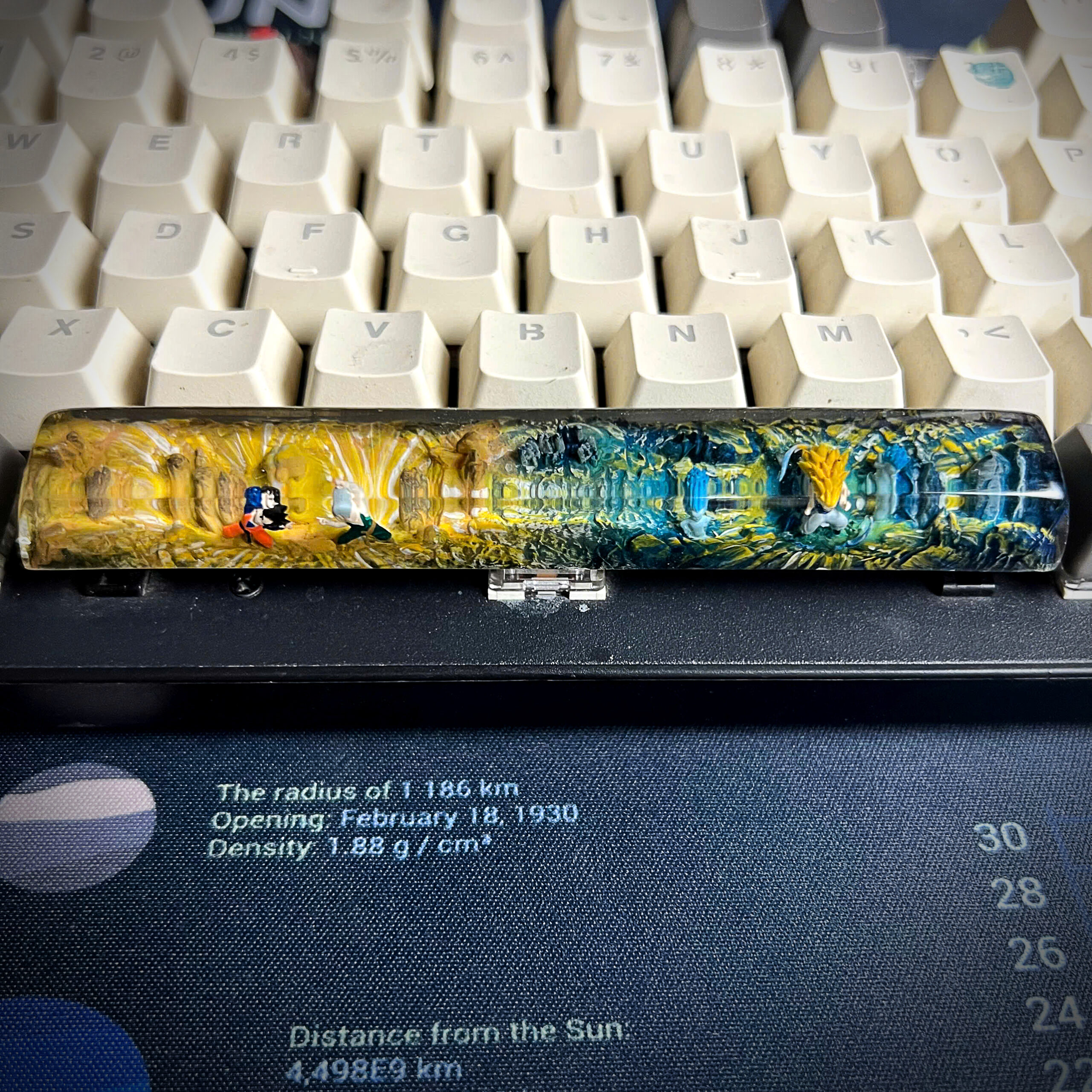 Bring the spirit of Dragon Ball Z to your mechanical keyboard with this handmade resin spacebar, inspired by the legendary anime series that defined generations. This unique keycap showcases iconic elements from the DBZ universe, blending vibrant colors, energy waves, and character silhouettes into a stunning piece of functional art.