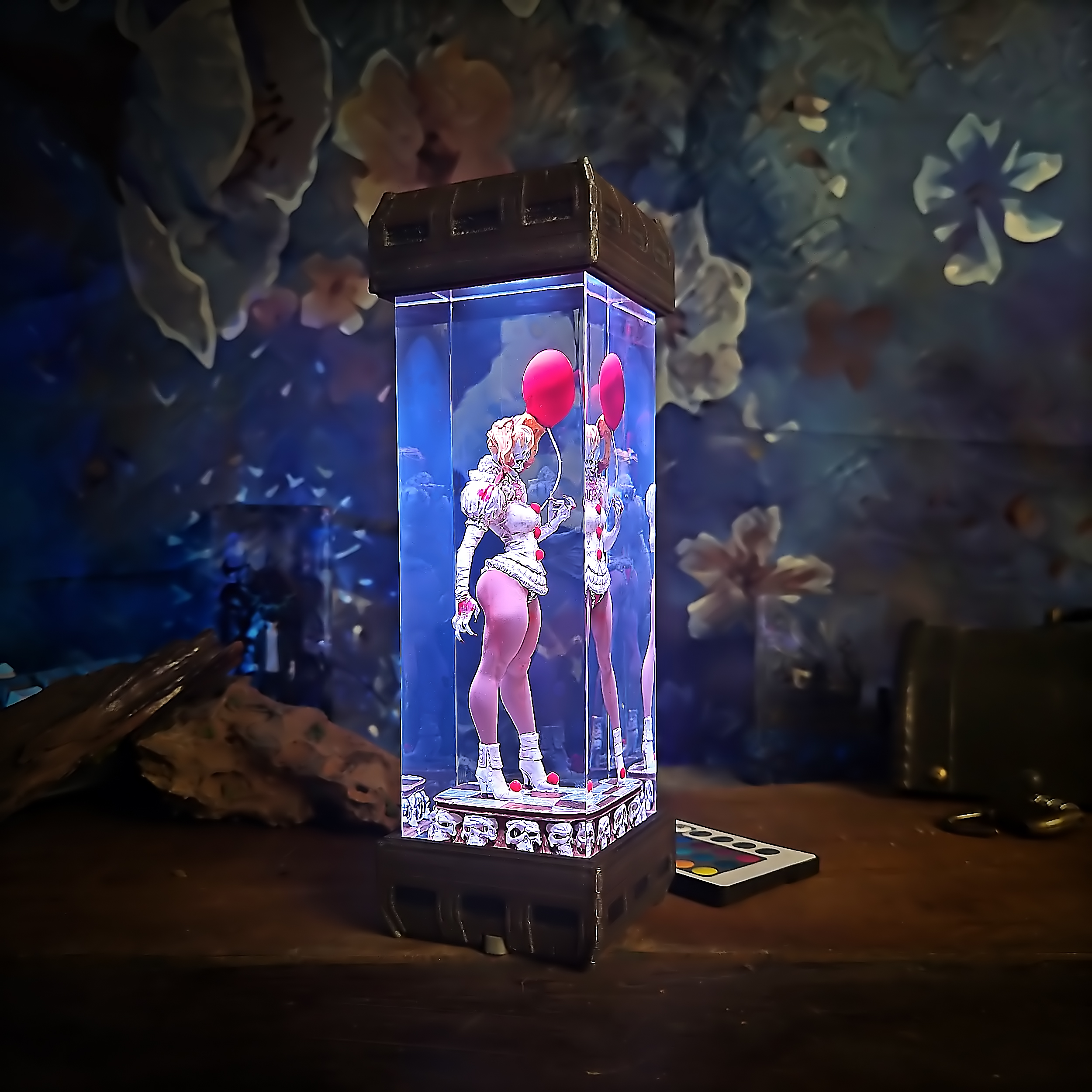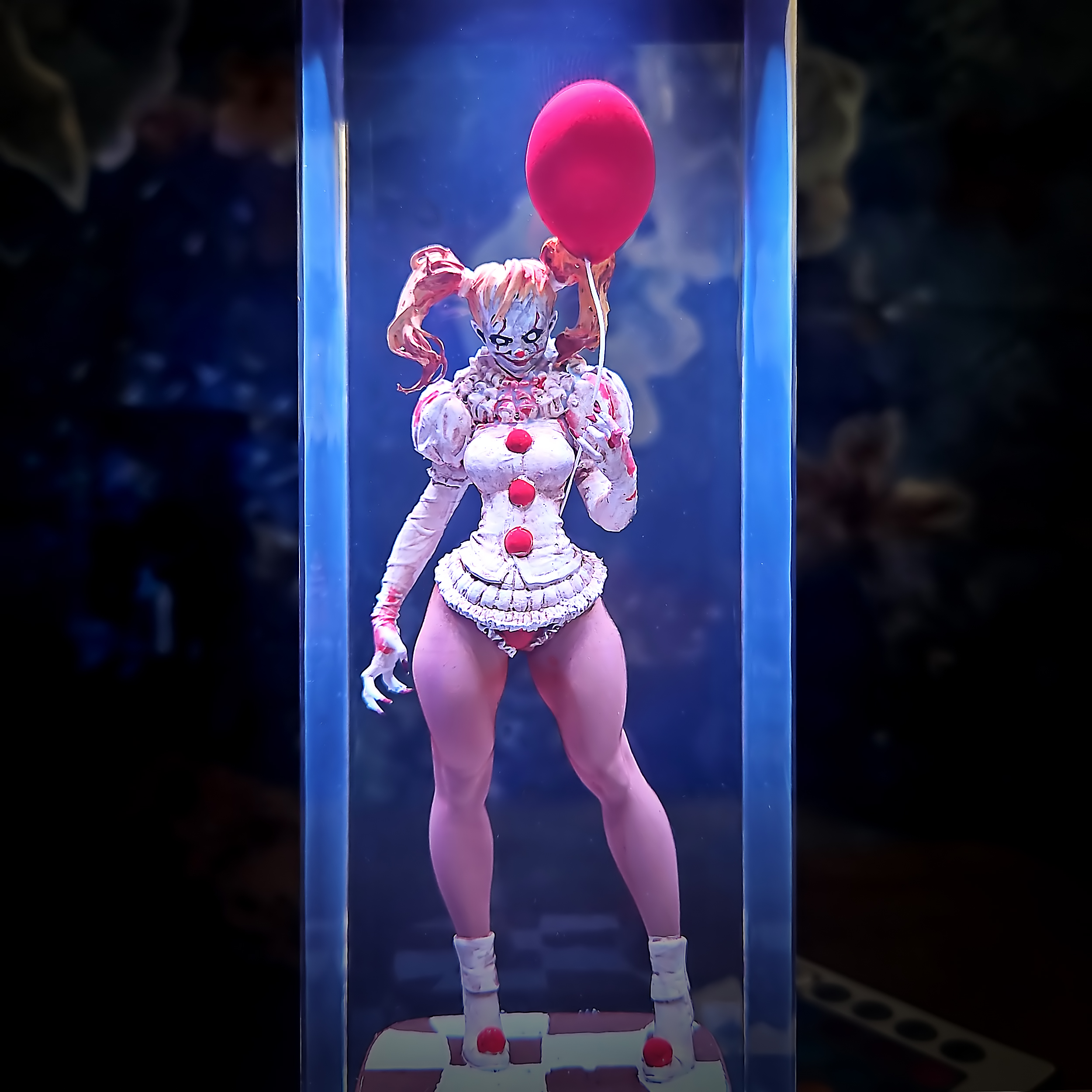 Illuminate your space with the terrifying presence of Pennywise from IT. This resin lamp captures the sinister clown in vivid detail, glowing softly to create a spooky yet captivating atmosphere.