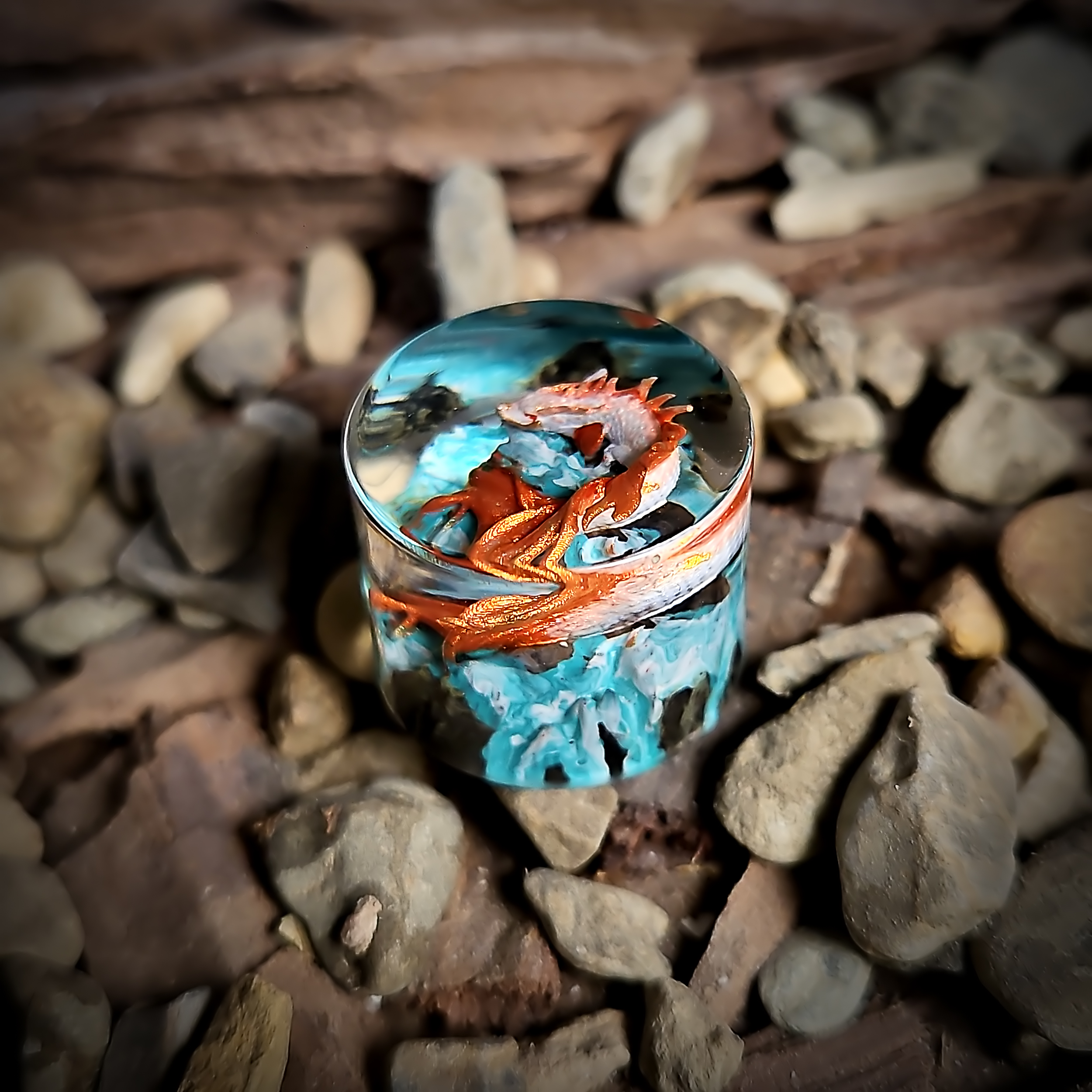 Encased within a crystal-clear resin dome, the Dragon Koi appears to swim through swirling water currents, created with layered shades of blues and whites that add depth and motion. The glossy resin finish enhances the shimmering scales and fluid lines, making the miniature aquatic scene vibrant and dynamic. Each turn of the knob reveals new angles of this exquisite work of art, immersing you in the lore and beauty of the Dragon Koi.