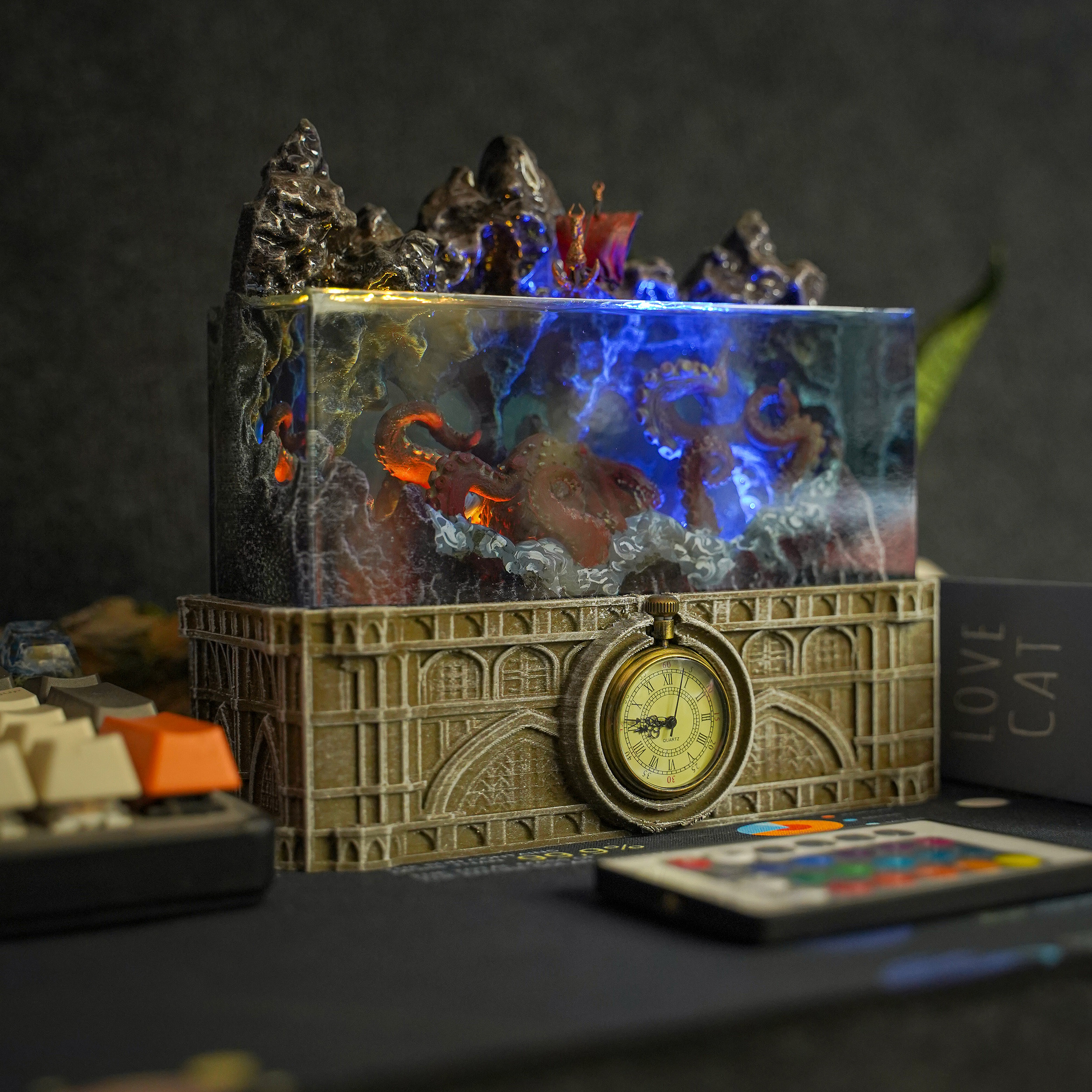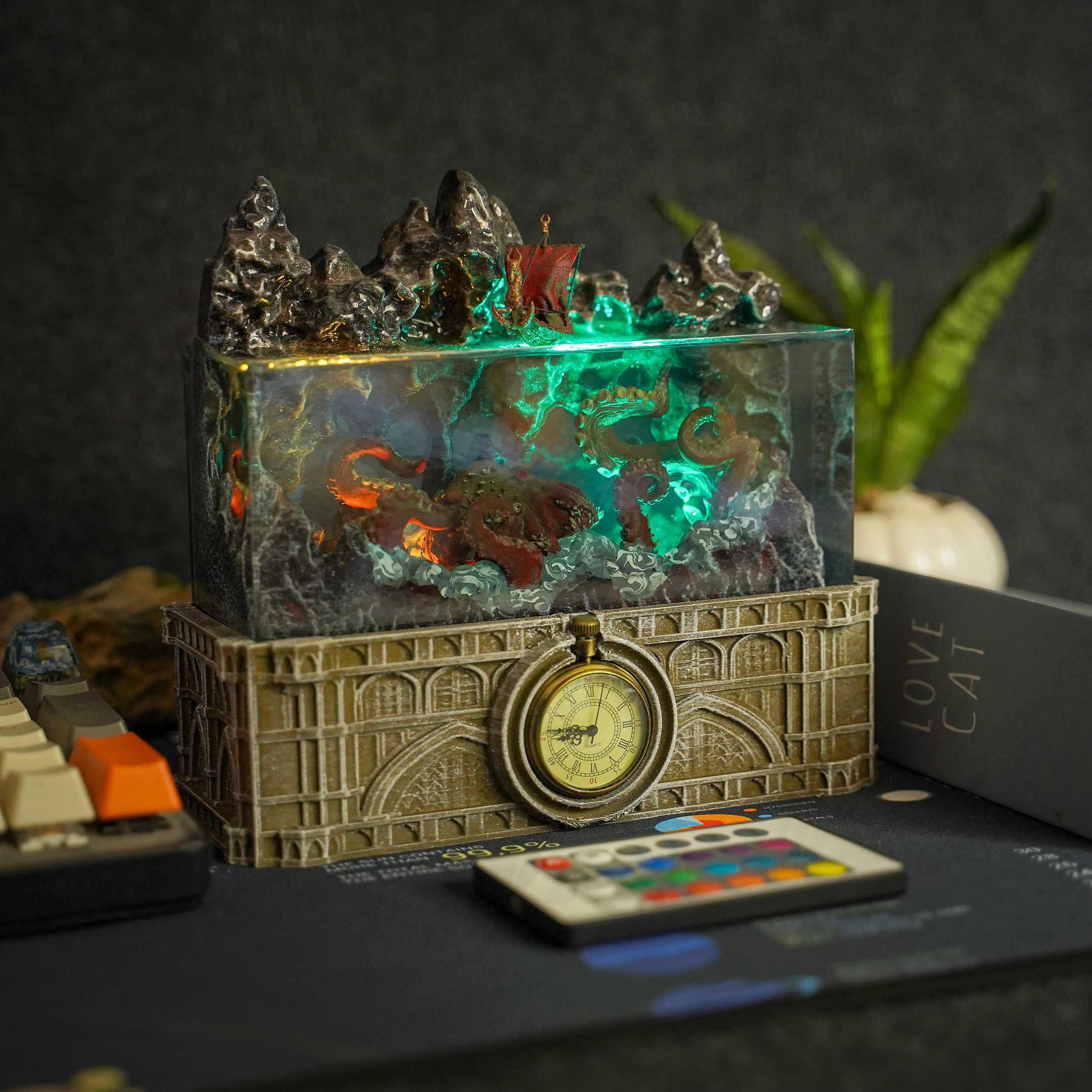 Dive into the deep mythos of the ocean with the Gothic Kraken Resin Lamp. A mighty kraken coils around a shipwreck or ruin, frozen in motion beneath translucent resin. The internal glow reveals fine tentacle textures and underwater chaos, perfect for fans of sea legends and fantasy.