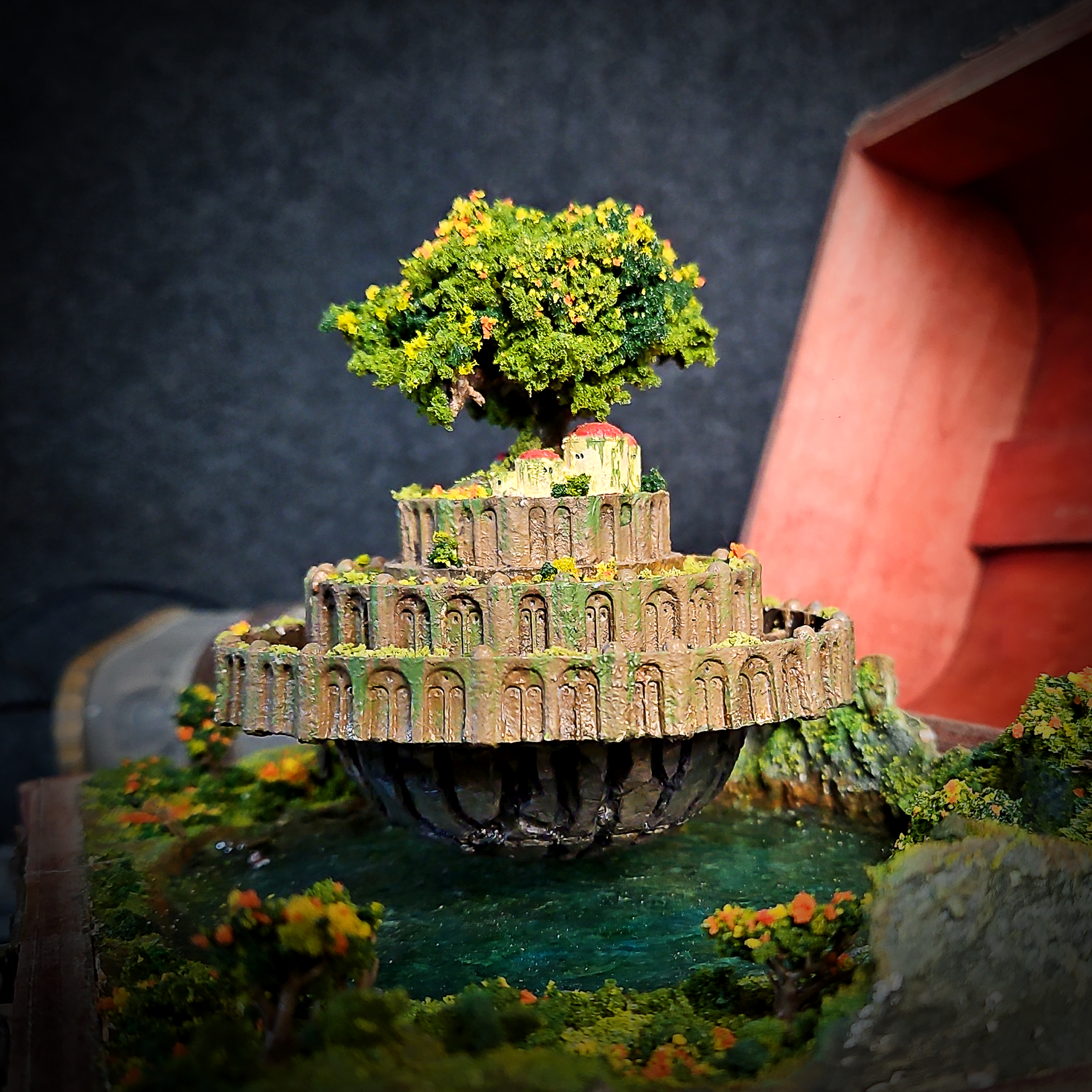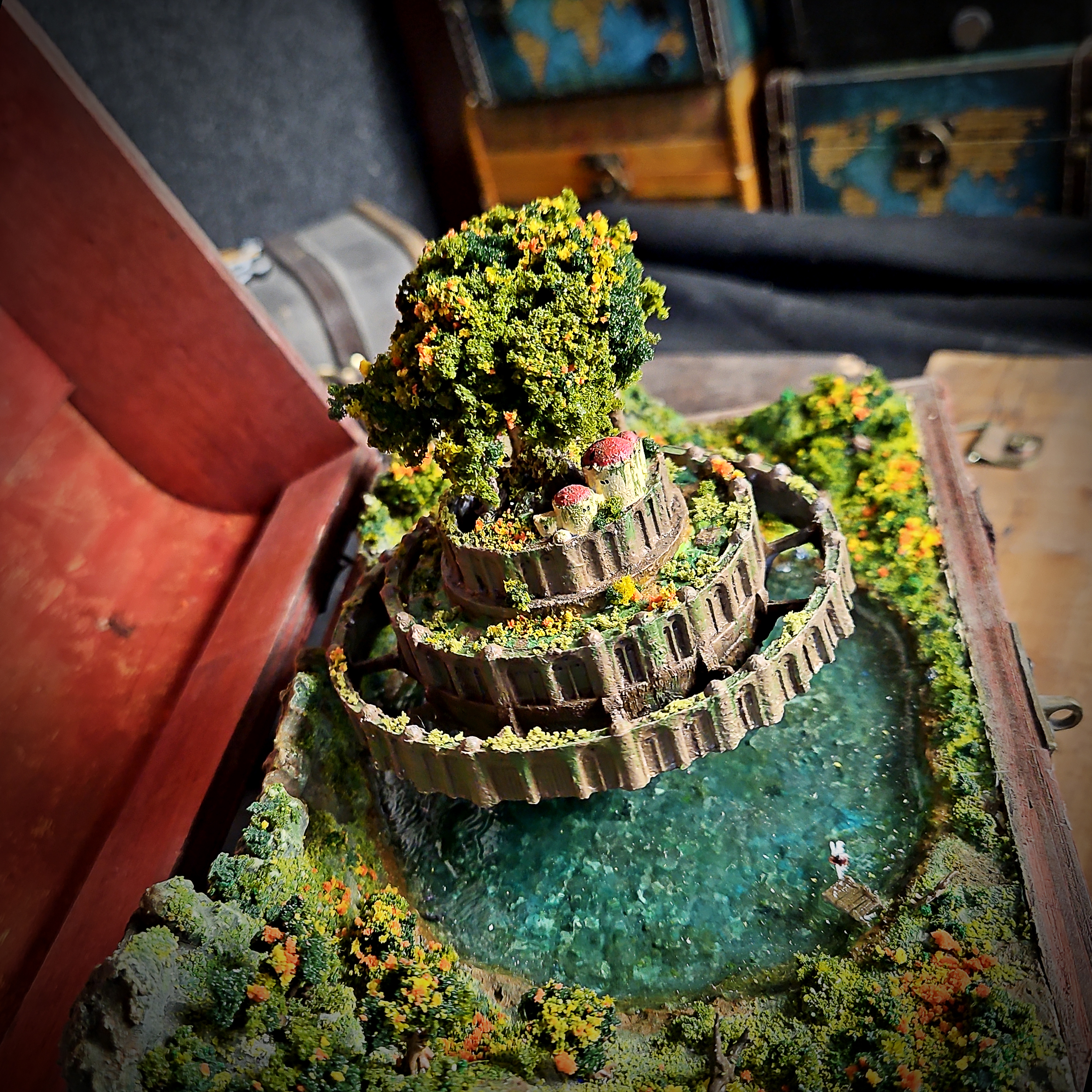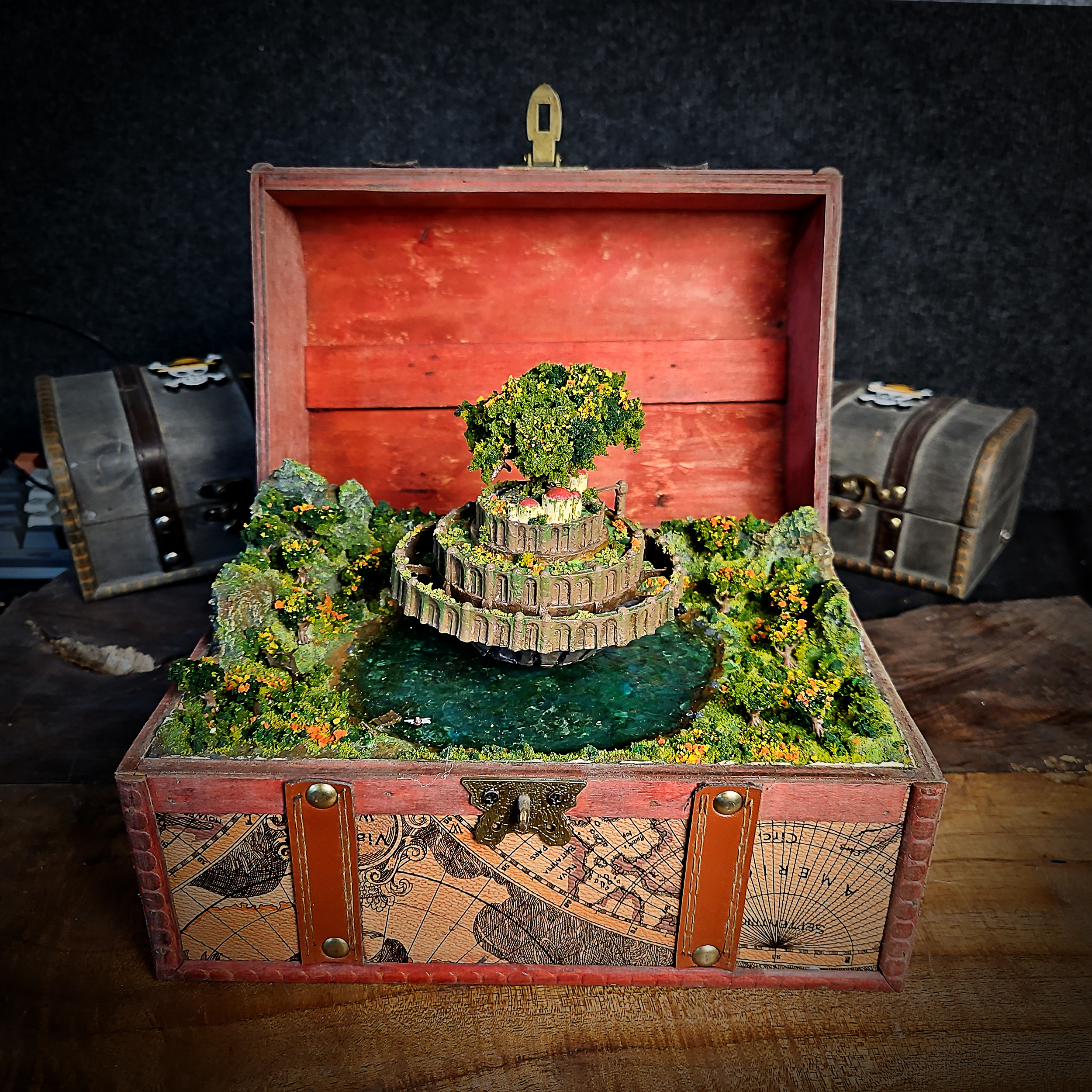 Miniature scene elements such as trees, figures, or buildings are handcrafted from resin using silicone molds or sculpted manually. These pieces are also painted and detailed to match the overall composition and bring the miniature world to life.