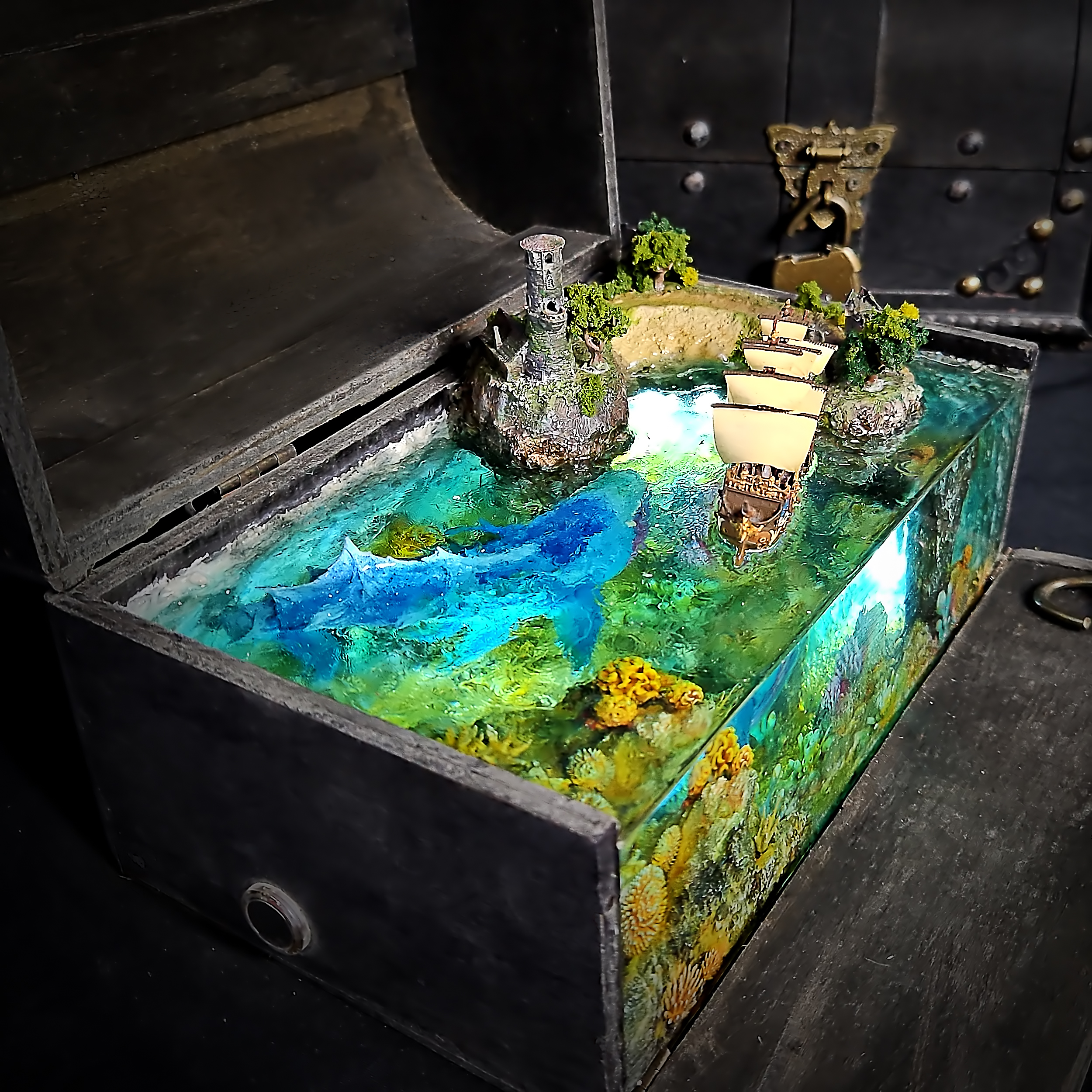 Miniature scene elements such as trees, figures, or buildings are handcrafted from resin using silicone molds or sculpted manually. These pieces are also painted and detailed to match the overall composition and bring the miniature world to life.