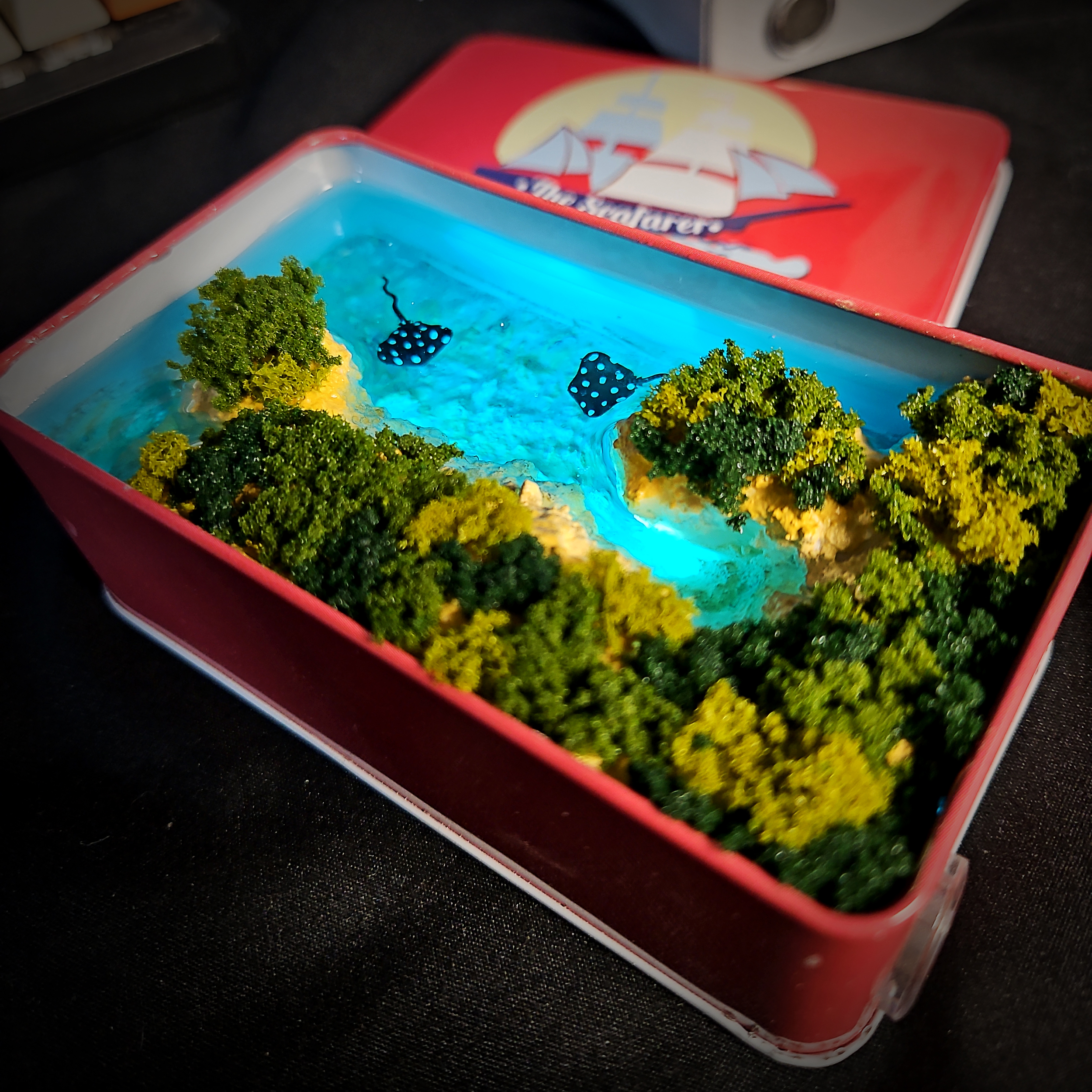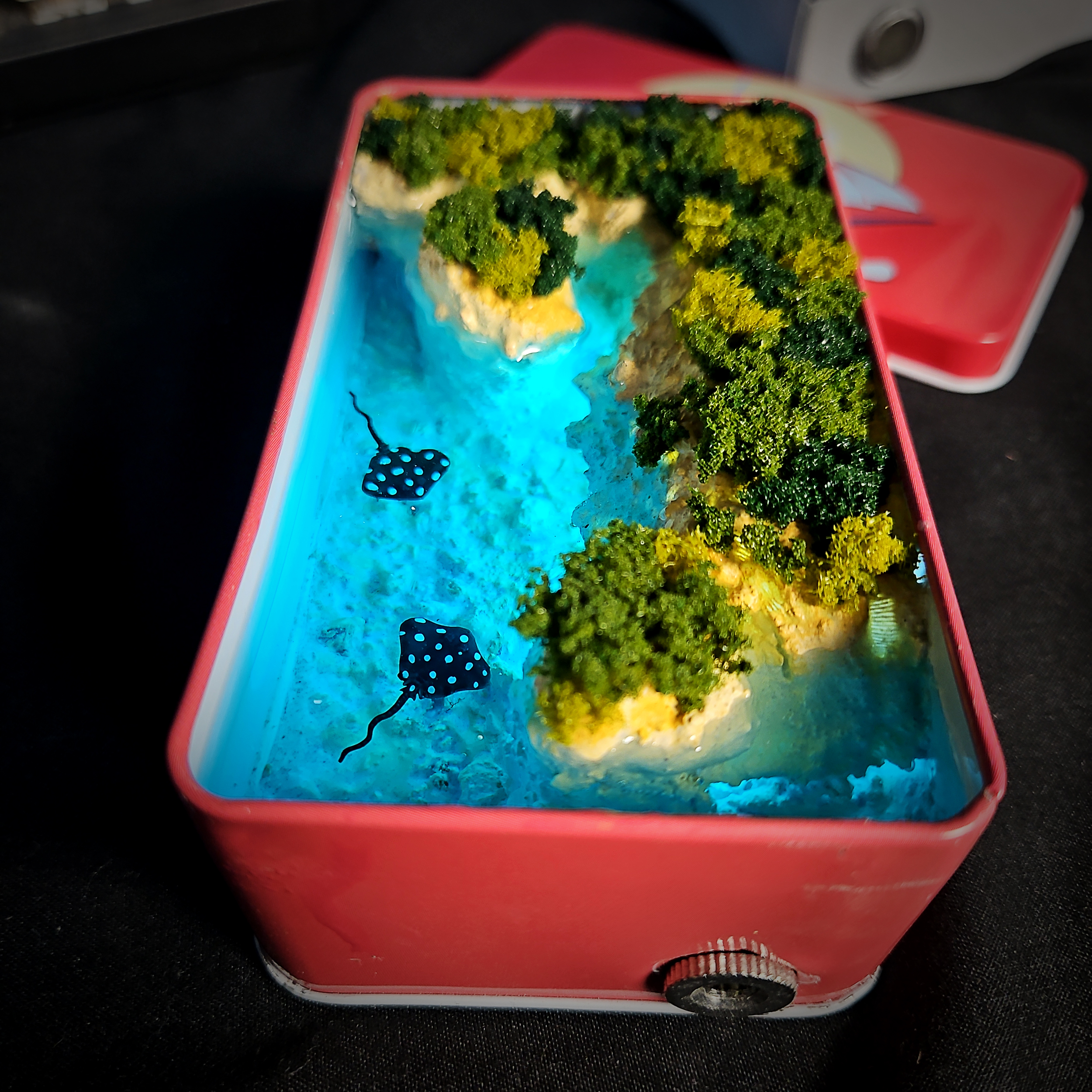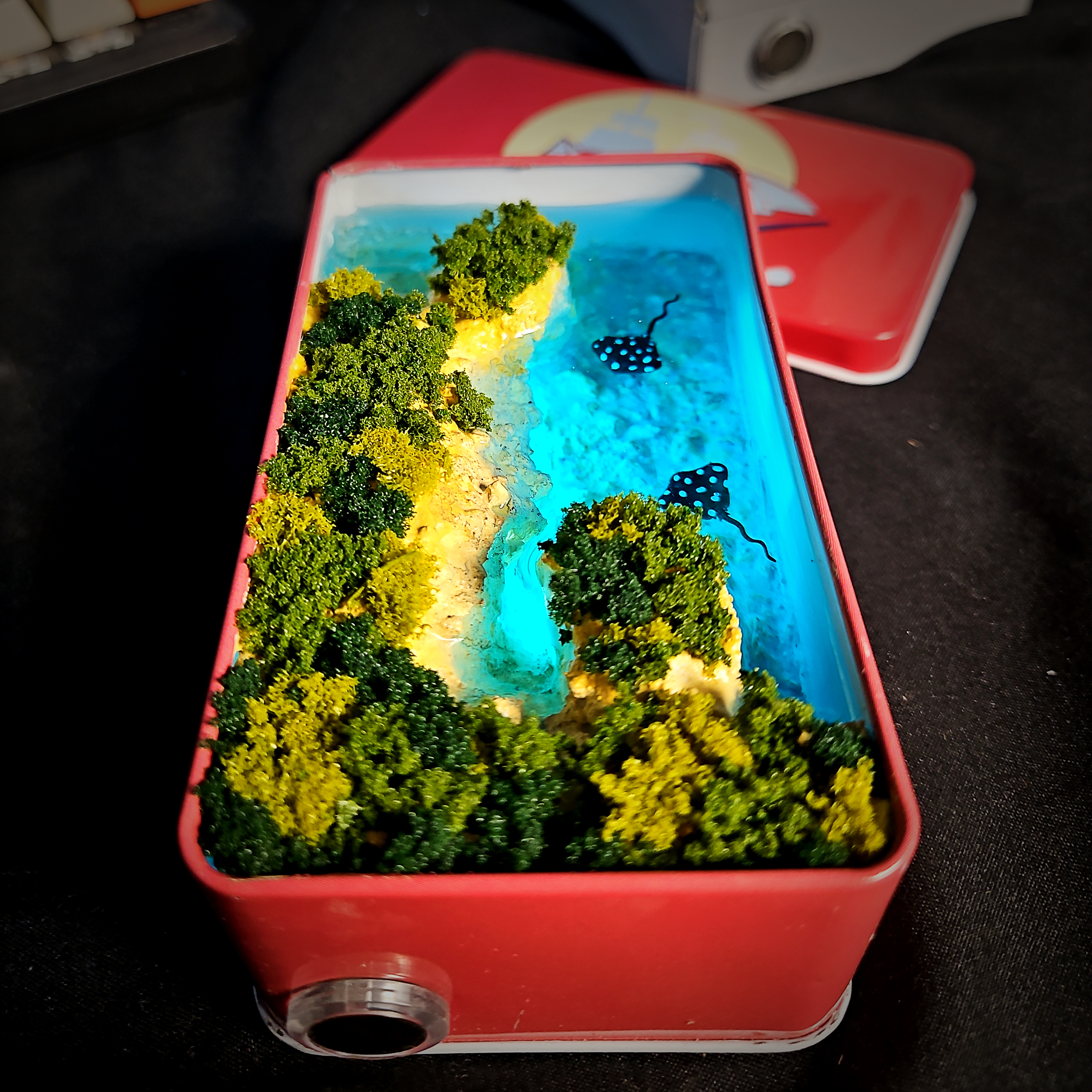 Miniature scene elements such as trees, figures, or buildings are handcrafted from resin using silicone molds or sculpted manually. These pieces are also painted and detailed to match the overall composition and bring the miniature world to life.