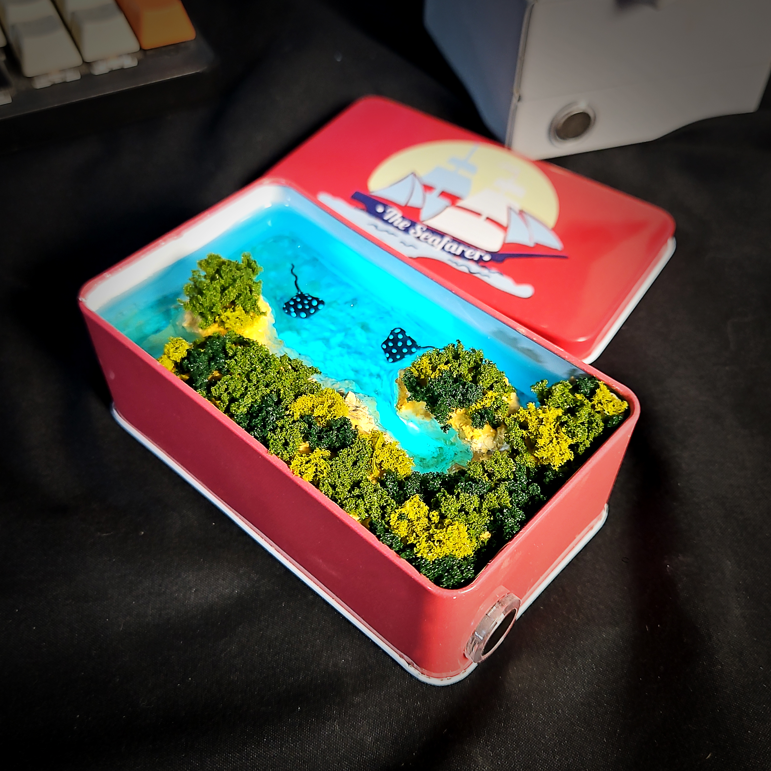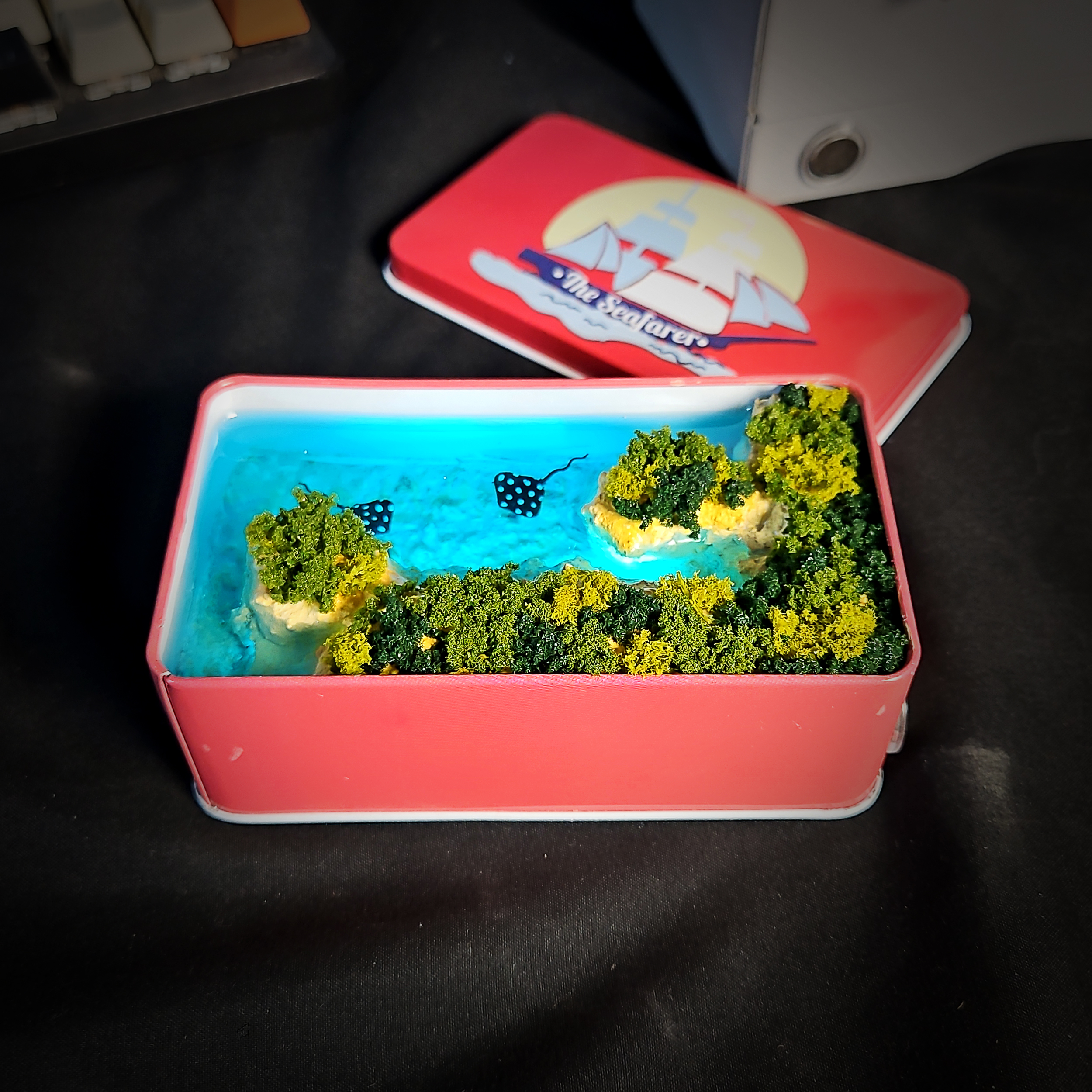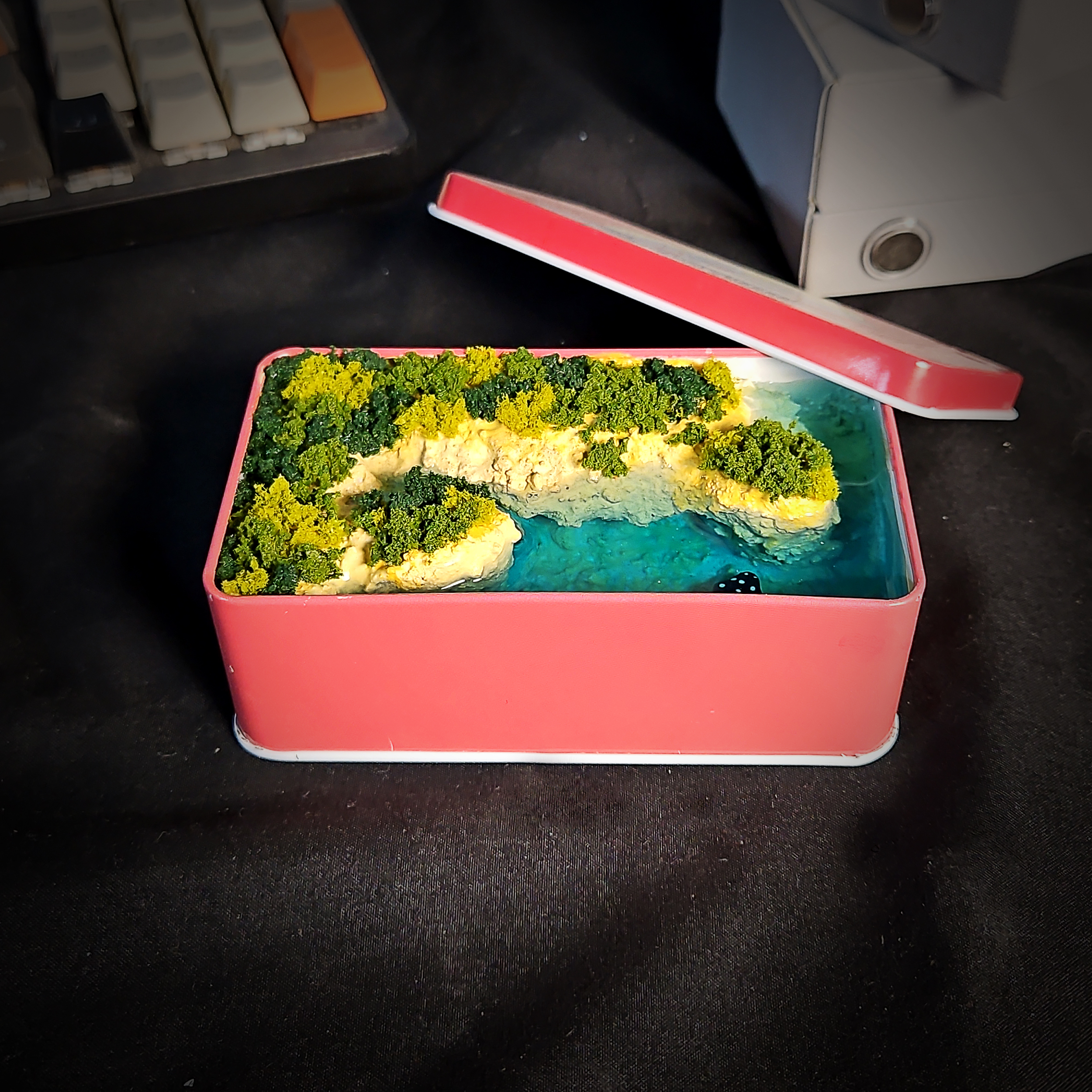 Miniature scene elements such as trees, figures, or buildings are handcrafted from resin using silicone molds or sculpted manually. These pieces are also painted and detailed to match the overall composition and bring the miniature world to life.