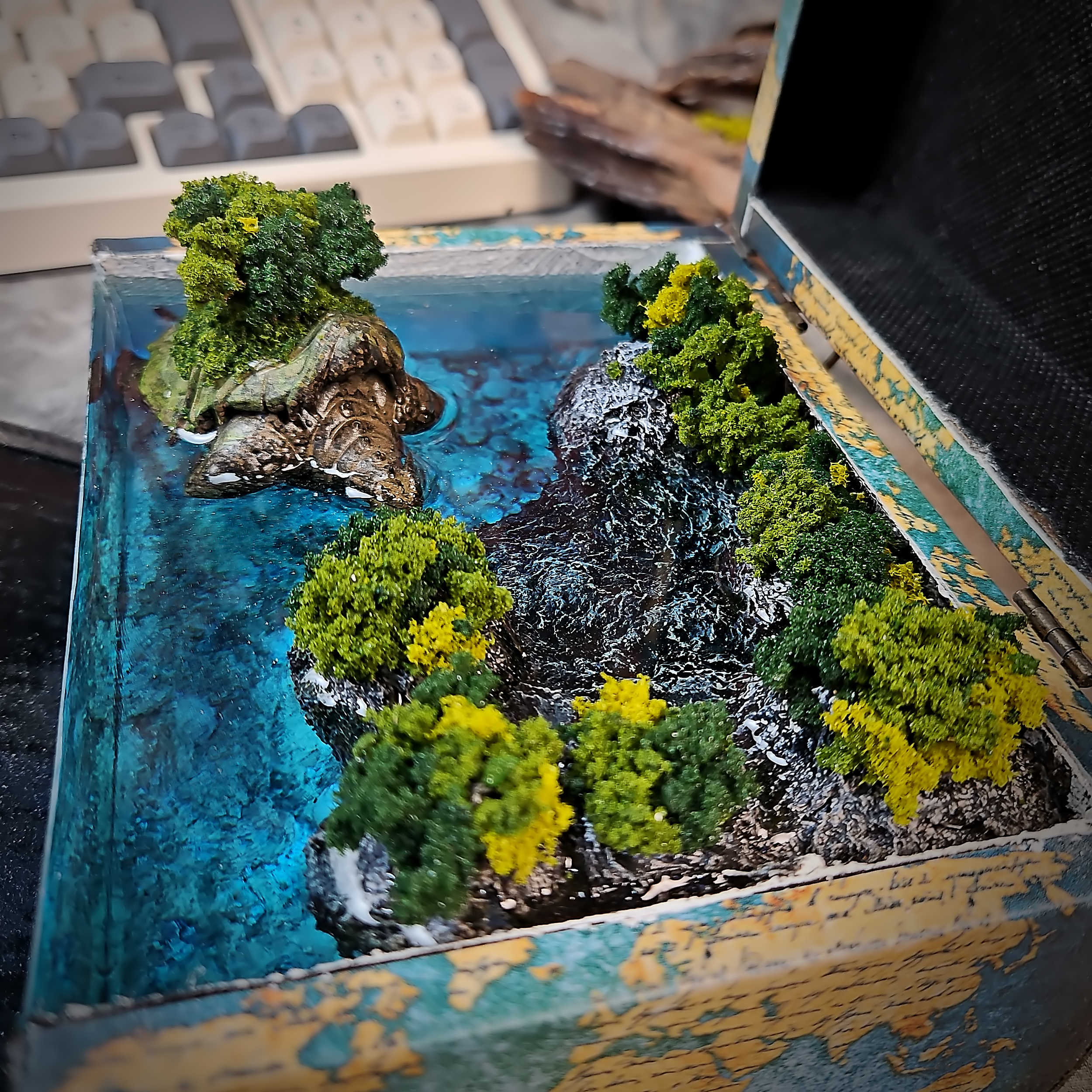 Miniature scene elements such as trees, figures, or buildings are handcrafted from resin using silicone molds or sculpted manually. These pieces are also painted and detailed to match the overall composition and bring the miniature world to life.