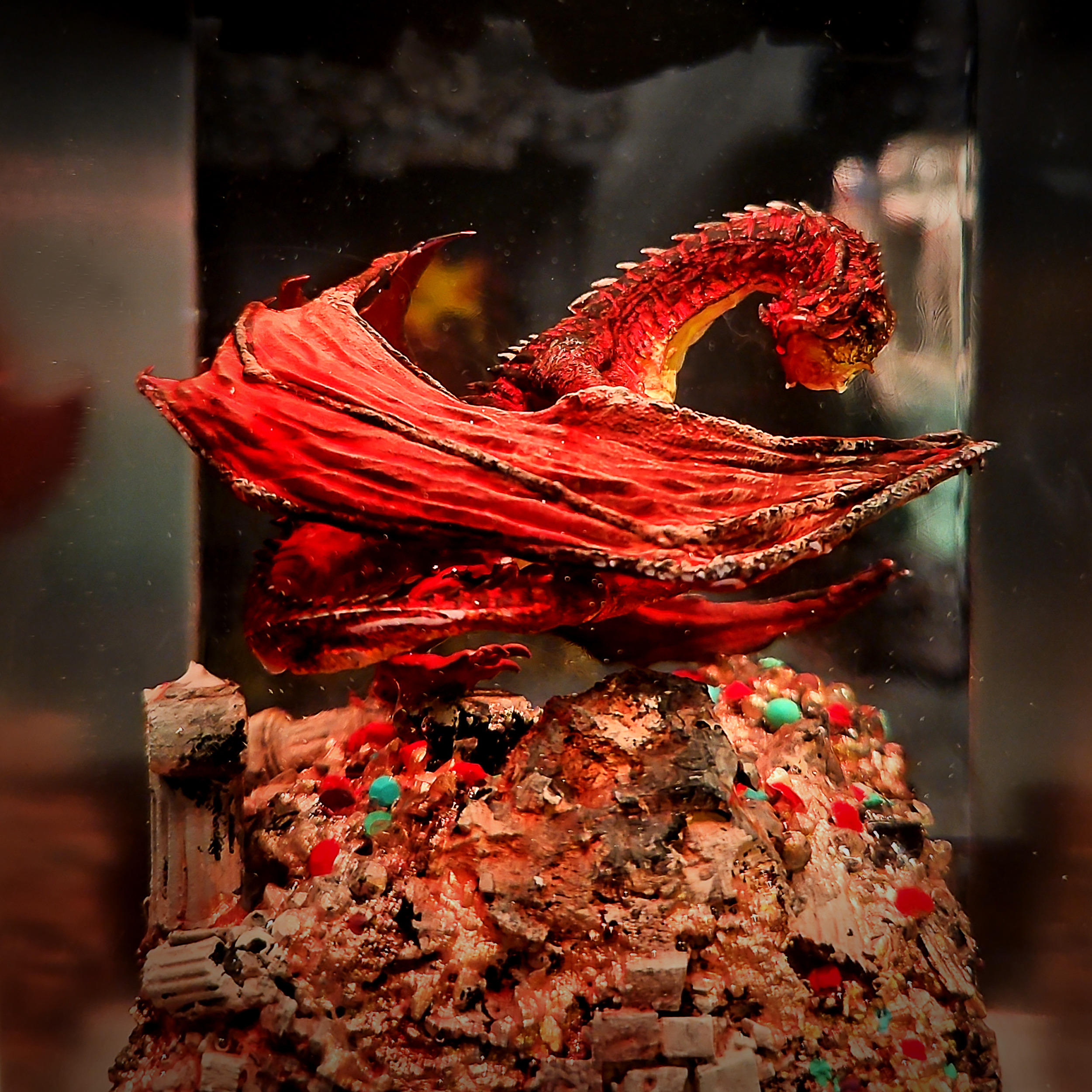 Inspired by the legendary dragon from The Hobbit, the SMAUG Resin Lamp is a tribute to power, greed, and grandeur. This miniature scene shows the beast resting atop his golden hoard, lit by a gentle glow.