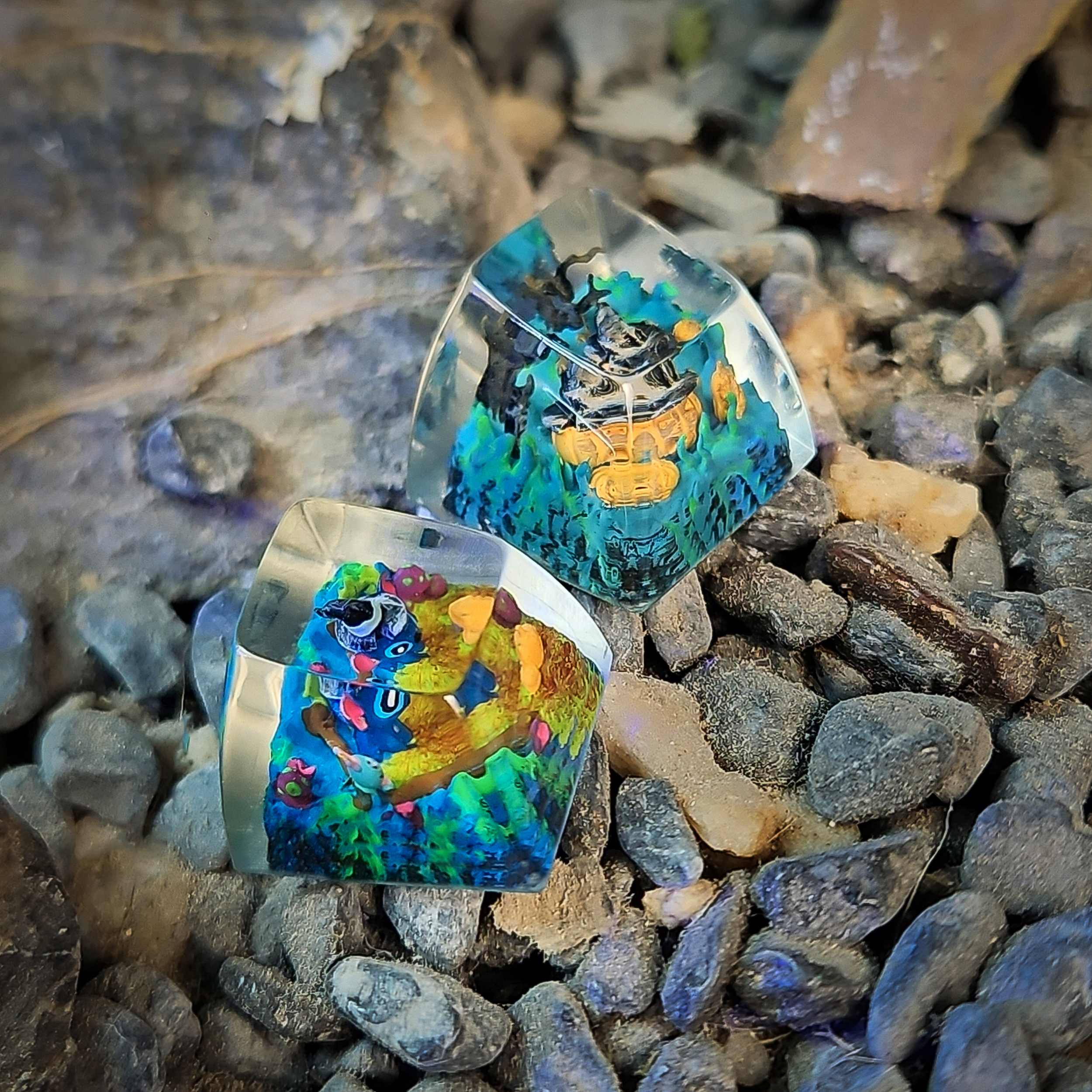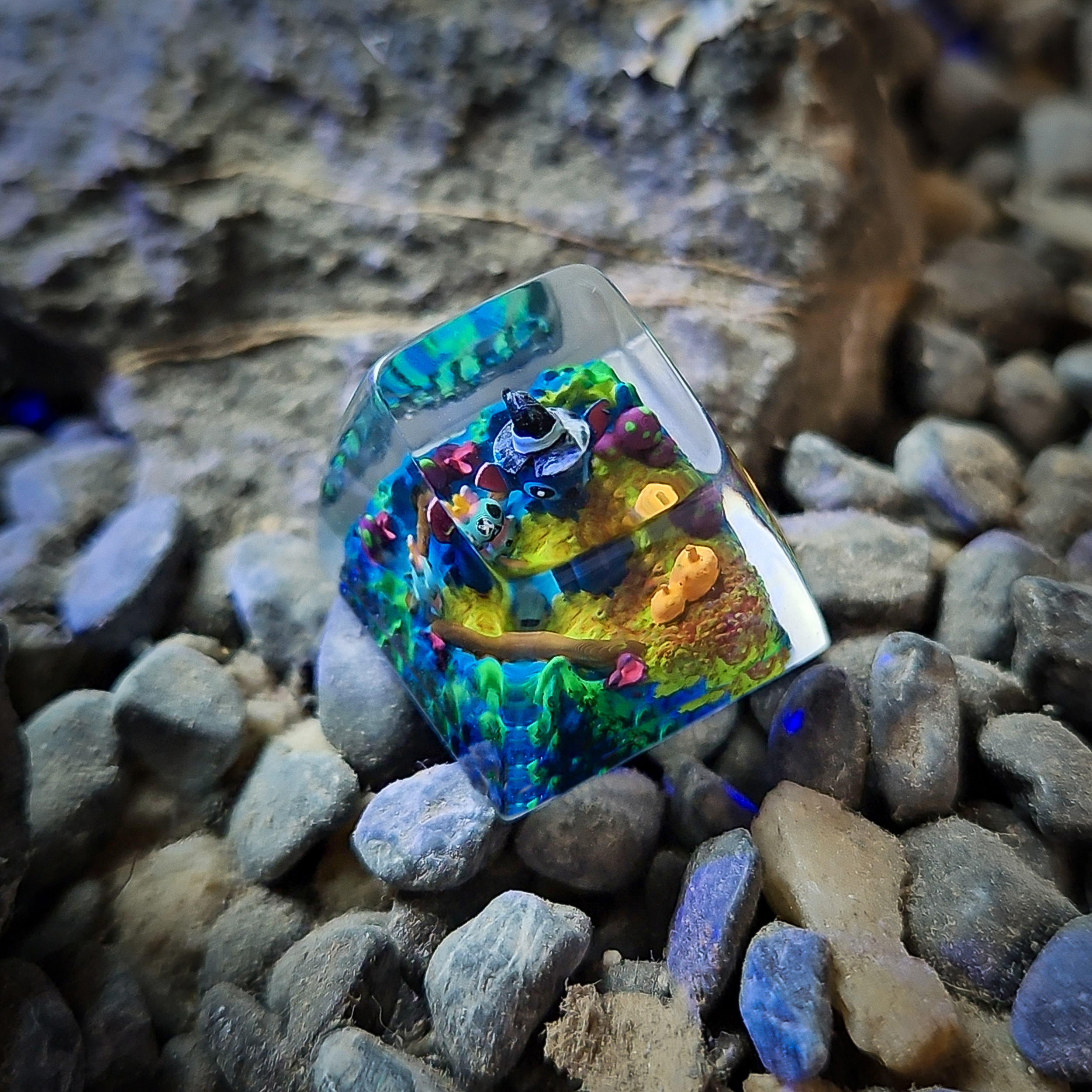Crafted with meticulous detail, the keycap showcases Stitch wearing a tiny pumpkin hat and holding a trick-or-treat bag, surrounded by subtle autumnal colors and Halloween motifs like bats and candy. The layered resin gives depth and vibrancy, making this festive Stitch truly come alive.