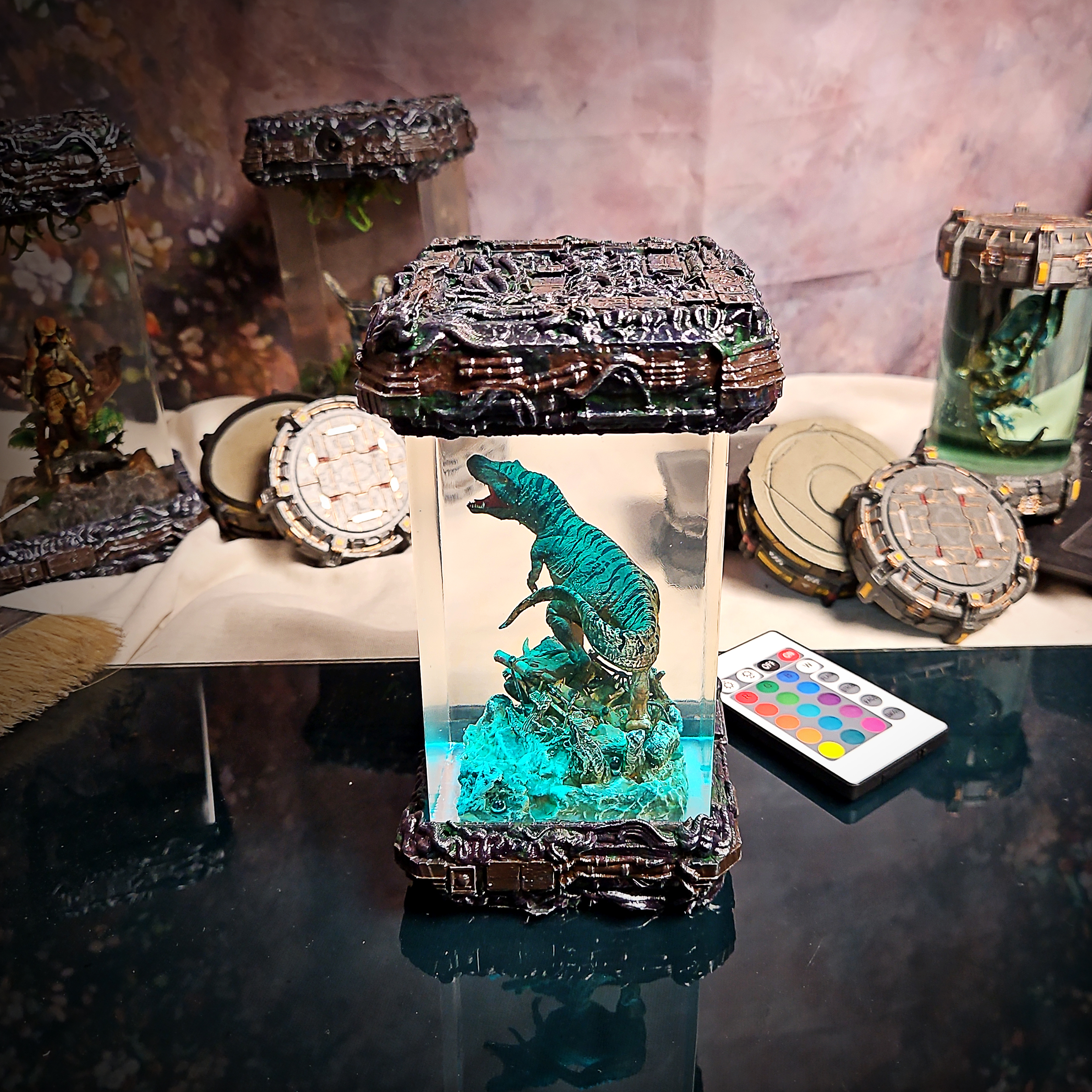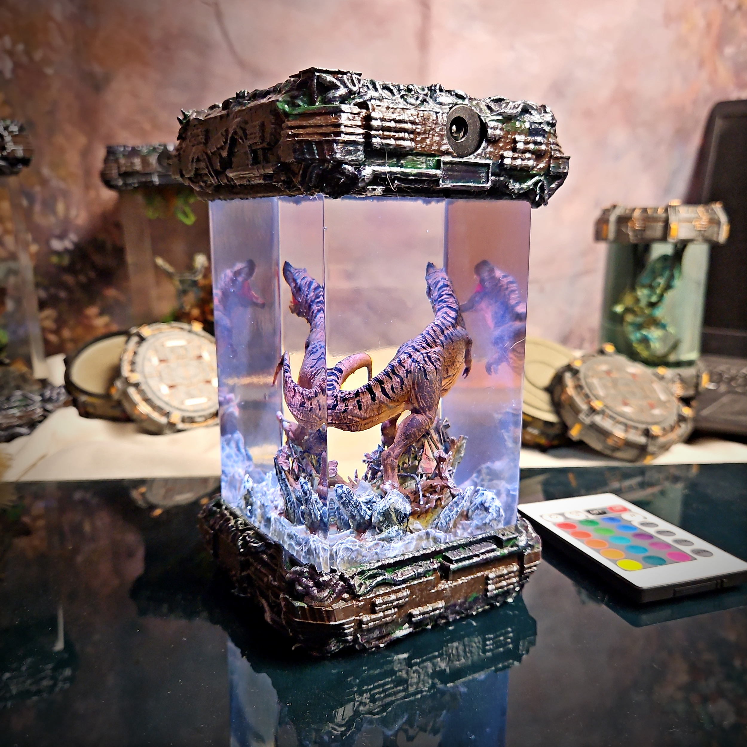 - Finishing Touches: The lamp is polished, and LED lighting is integrated to highlight the T-Rex.