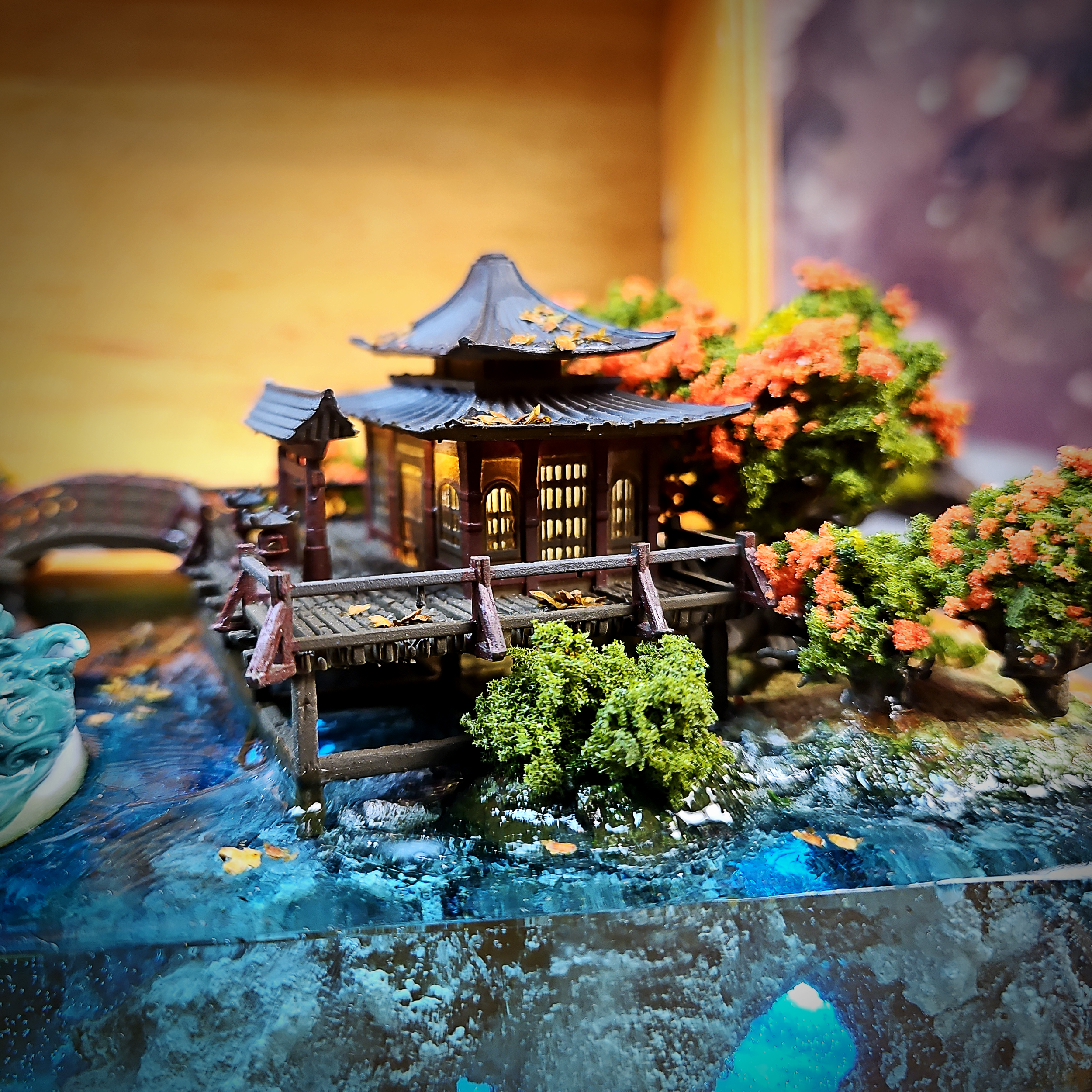 Miniature scene elements such as trees, figures, or buildings are handcrafted from resin using silicone molds or sculpted manually. These pieces are also painted and detailed to match the overall composition and bring the miniature world to life.